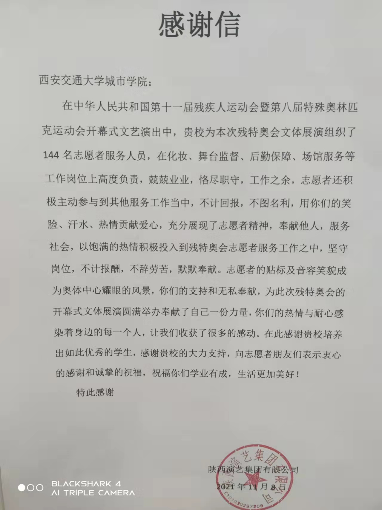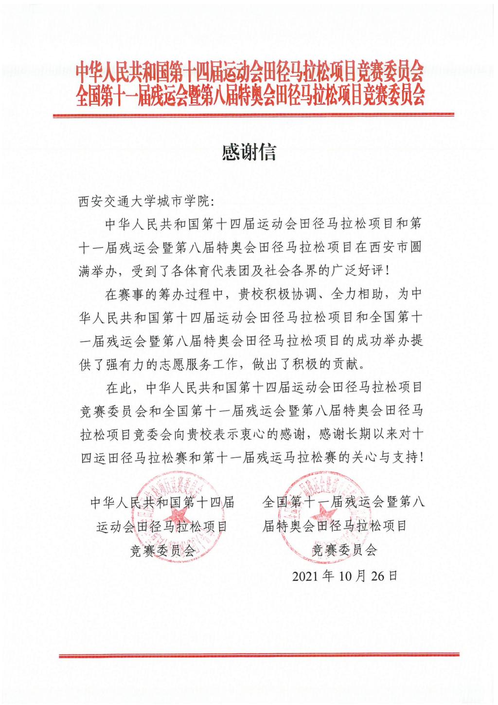 近日,yl7703永利官网分别收到第十四届全国运动会田径马拉松项目竞赛委员会、第十一届残运会暨第八届特奥会田径马拉松项目竞赛委员会、陕西演艺集团有限公司发来的感谢信。信中对我院全体志愿者与带队老师在十四运与残特奥期间的志愿服务工作给与了高度肯定,对学院大力配合赛会工作表示衷心的感谢。