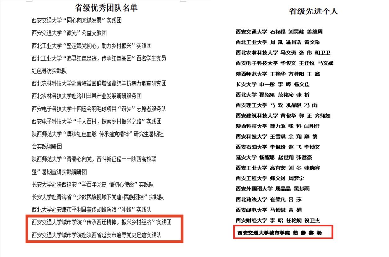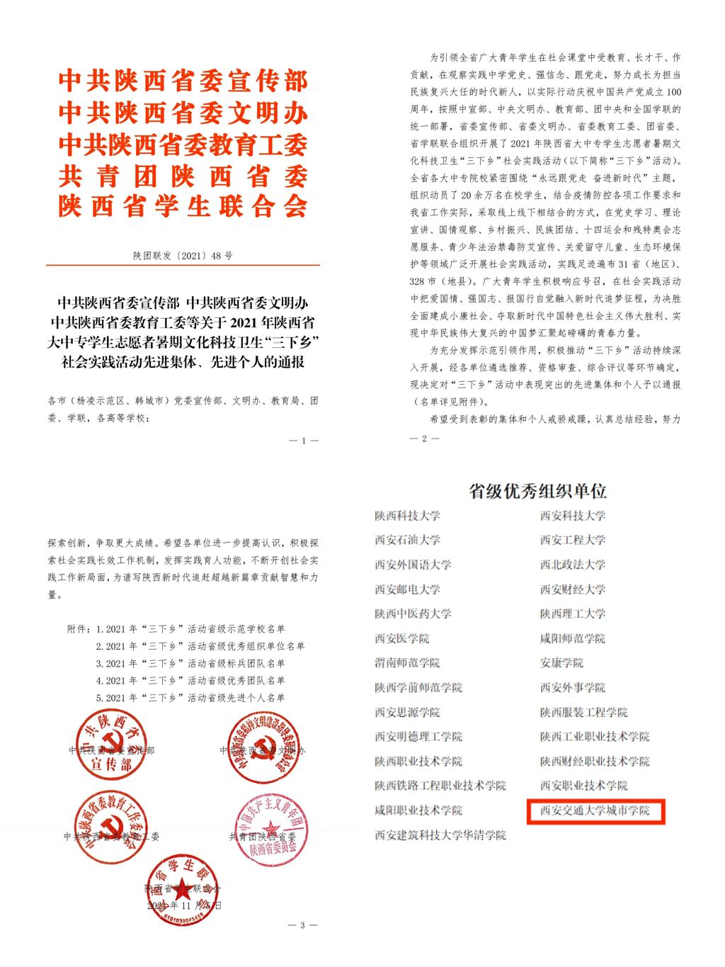 近日,省委宣传部、省教工委、省文明办、团省委、省学联,联合下发了《关于2021年陕西省大中专学生志愿者暑期文化科技卫生“三下乡” 社会实践活动先进集体、先进个人的通报》,对在2021年暑期“三下乡”活动中表现突出的单位、团队和个人给予通报表扬。其中yl7703永利官网荣获优秀组织单位称号,“传承西迁精神,振兴乡村经济”实践团、赴陕西省延安市追寻党史足迹实践队获优秀团队称号;茹静、黎杨荣获先进个人称号。
