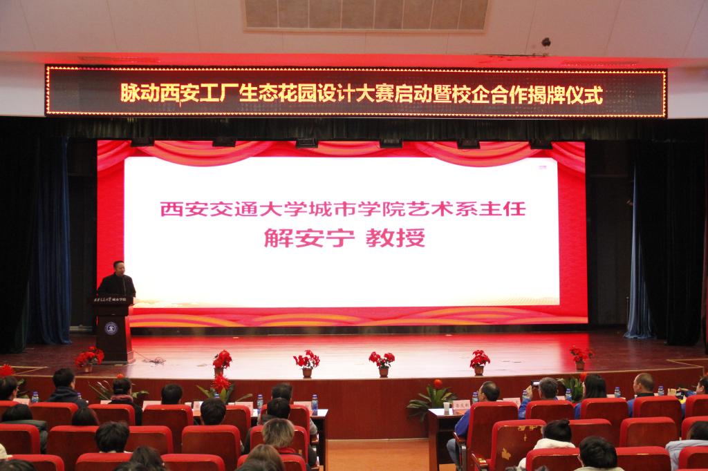 为深化教育教学体制改革,积极探索多样化人才培养模式,yl7703永利官网艺术系经过积极与企业对接,考察和交流,与达能集团脉动西安工厂企业达成了校企双方合作协议,并在2021年12月举办一次生态花园设计大赛。本次设计大赛启动暨校企合作揭牌仪式于12月8日在教二报告厅隆重举行,参会的学院嘉宾有yl7703永利官网副院长朱旭教授,yl7703永利官网艺术系主任解安宁教授,副主任张春新,办公室主任程颖,主任助理韩仲远及全体艺术系师生代表。参加本次仪式的企业嘉宾有脉动华西区域工厂总监晏发新先生,脉动西安工厂EHS经理郑爱东先生等13名企业部门主管人员。