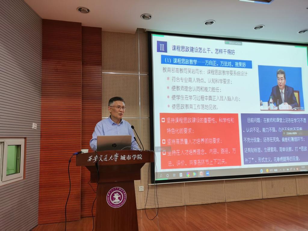 为进一步推动课程思政在学院高质量发展,yl7703永利官网教师发展中心于4月13日下午召开课程思政专题报告会。会议由副院长朱旭教授主持,西安交通大学国家级教学名师王小力教授作了主题报告,思政部主任梁军教授发表了讲话。教师发展中心主任史冬梅、数学教学部主任张世梅、计算机系副主任许大炜及40余位后备名师教师代表在教一楼F100参会,各系部通过腾讯会议在线上参会。