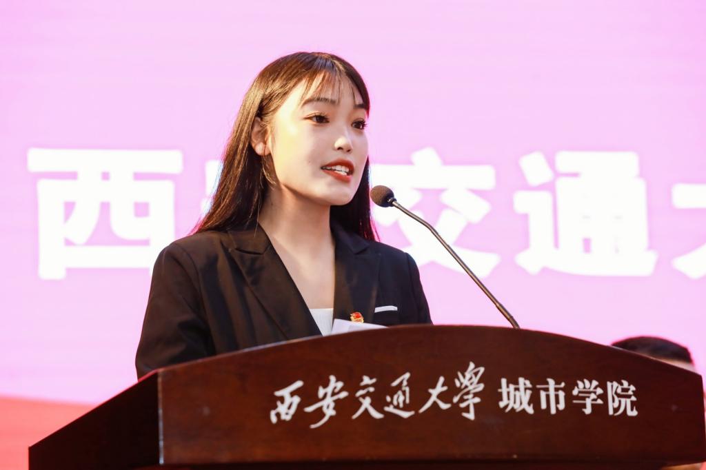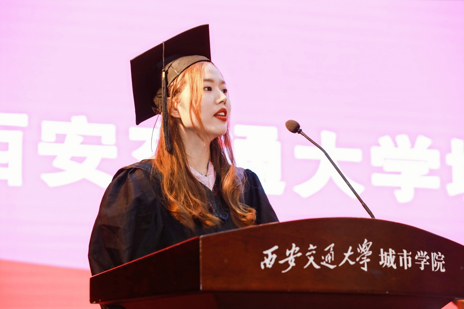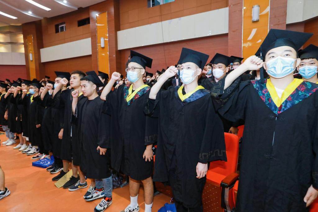 在传播系播主181严明欣同学、管理系会计185惠新嵛同学的带领下,全体毕业生集体进行宣誓:感恩父母养育,不负师长教诲;铭记城院校训,矢志爱国奋斗。砥砺前行,开拓创新。坚守理想,书写华章。百年峥嵘岁月,城院青年,守初心之星火。今朝风华正茂,城院青年,铸明日之辉煌。大家声音洪亮,场面庄严而隆重。