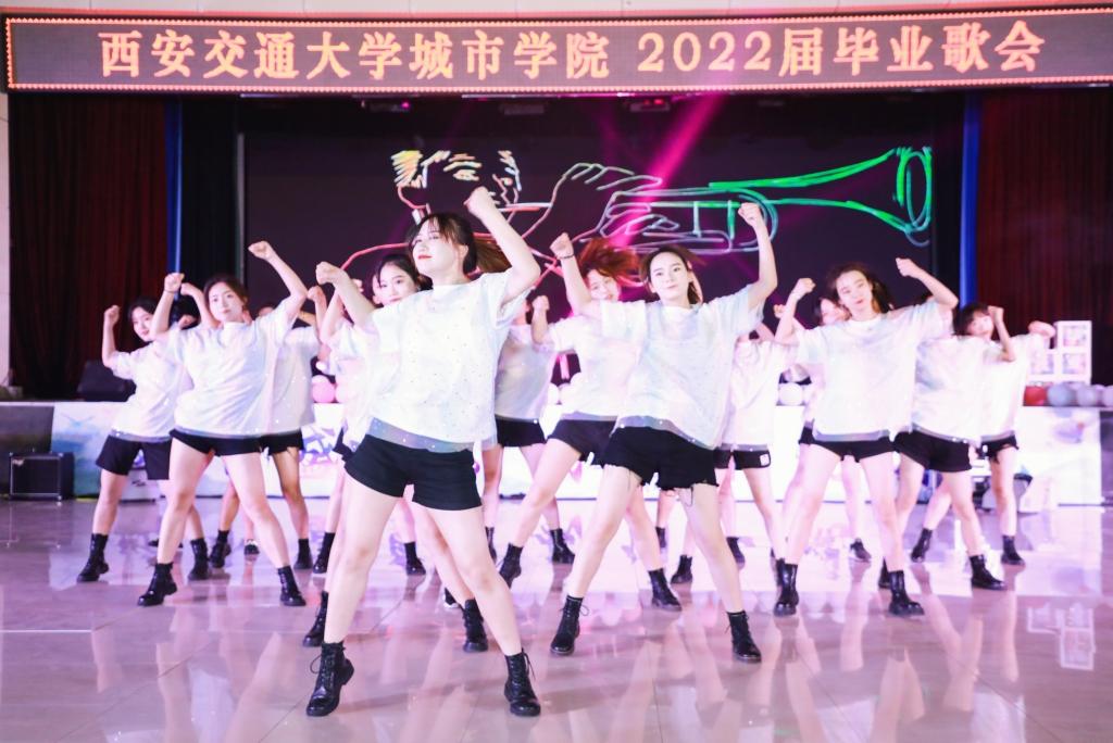 一支热情洋溢、活力四射的爵士舞《少年!敢》为歌会拉开序幕。一首首各具特色、脍炙人口的歌曲《我乘着风飞过来》《我喜欢》《我的未来式》,诉说了城院学子初入校园的欣喜和对未来校园生活的期望。伴随着《致青春》《渔光曲》《爱的华尔兹》等舞曲青春的节拍和悠扬的琴声,舞蹈团及现场毕业生起立共舞,优美的舞姿、青春的笑脸,刻画出了城院生活最美的样子。