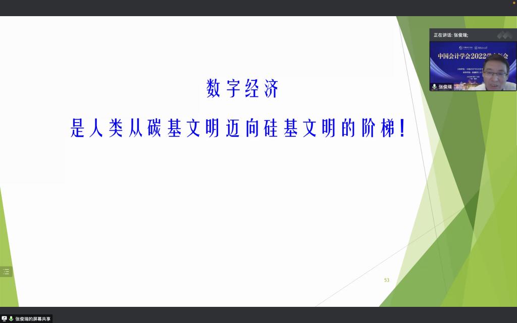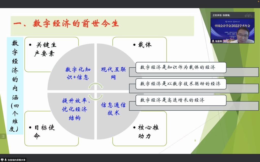 张俊瑞教授报告的主题是“数字经济、数据资产及其会计研究”。从数字经济的前世今生谈起,通过数字经济关键词的演变,结合国内数字经济已有相关研究成果,在界定数据、信息、数据资产的概念及内涵的基础上,详细介绍了其所带领的团队近几年来围绕数据资产所进行的理论及实证研究。张俊瑞教授及其团队的研究涉猎数据资产在会计学上的界定、数据资产的确认、计量与财务列报等会计基本理论问题,还涉及数据资产信息披露与分析师盈余预测、数据资产信息披露与审计收费等关系的实证研究,这些成果对于数字经济背景下我国数据资产会计学术研究具有引领和推动作用。