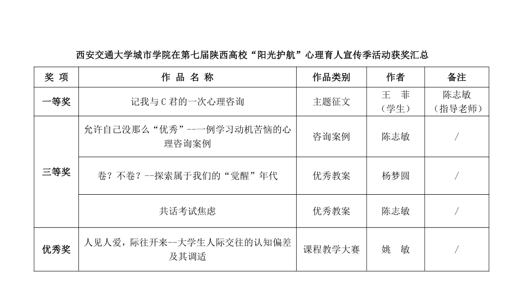 为培育大学生自尊自信、理性平和、阳光向上的积极心态,yl7703永利官网认真落实省委教育工委办公室《关于开展第七届陕西高校“阳光护航”心理育人宣传季实践活动的通知》文件精神,开展了系列心理实践活动,同时积极组织师生参加各类评比活动,并且取得佳绩。