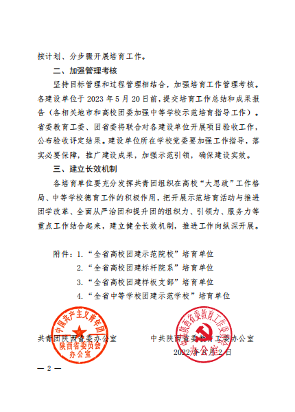 据悉,按照《共青团陕西委、中共陕西省委教育工委关于印发〈关于开展全省学校团建示范培育工作〉的通知》文件安排,经高校推荐、资格审查,遴选产生20个高校团委、92个院系团组织、130个团支部分别作为全省学校团建示范培育单位,培育时间为2022年7月至2023年5月。