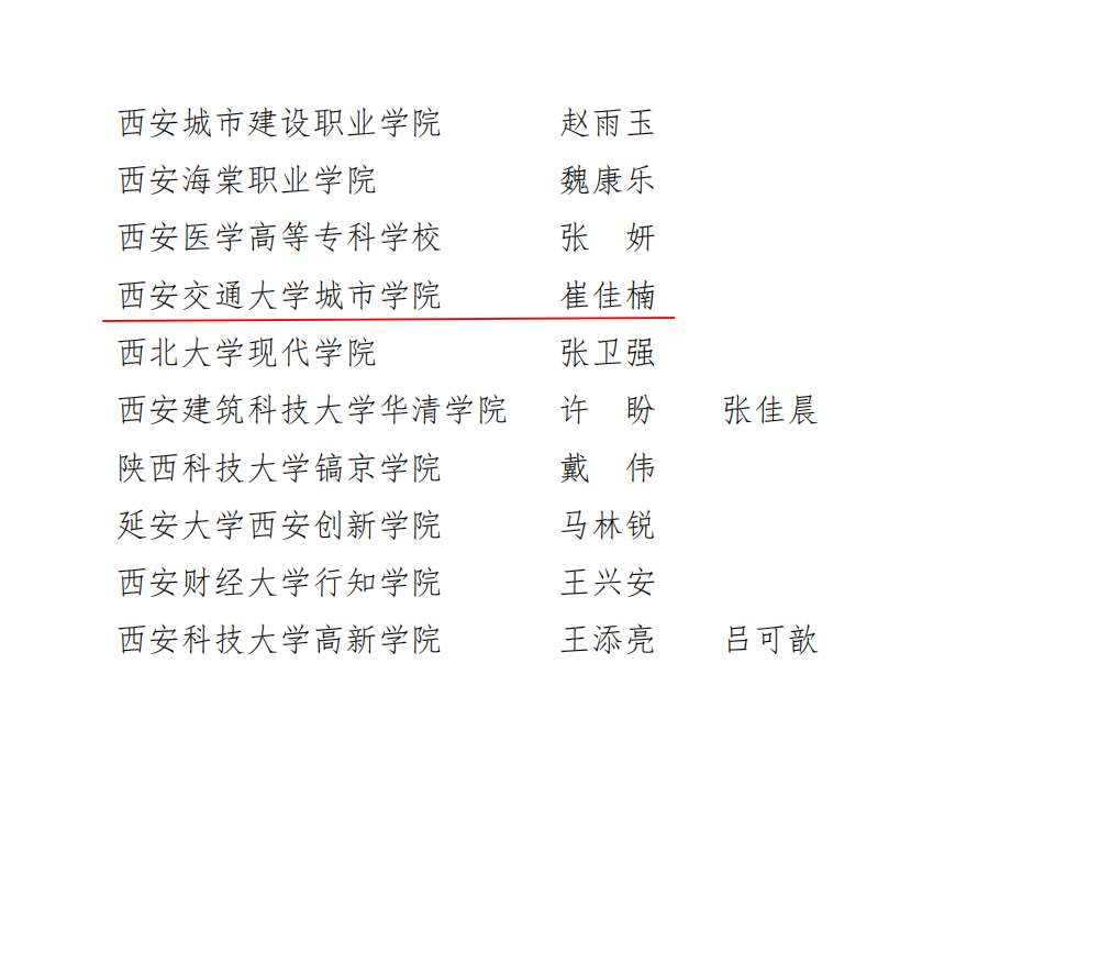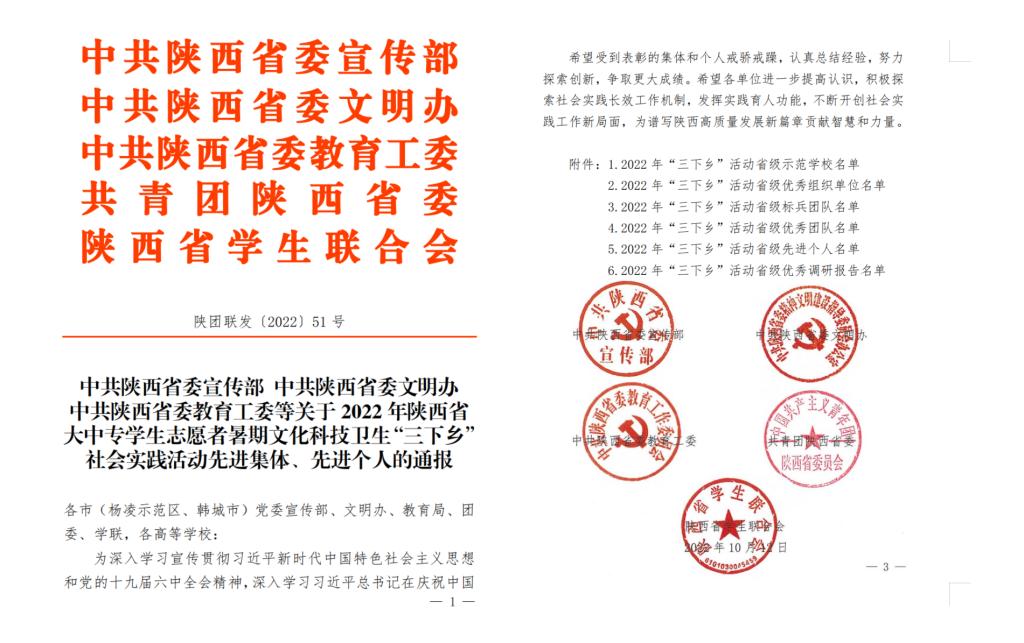 近日,共青团陕西省委公布了《中共陕西省委宣传部中共陕西省委文明办中共陕西省委教育工委等关于2022 年陕西省 大中专学生志愿者暑期文化科技卫生“三下乡”社会实践活动先进集体、先进个人的通报》,学院获得省级优秀组织单位荣誉称号,赴陕西省佛坪县“守护朝阳成长,助力乡村振兴”暑期社会实践团获省级优秀团队荣誉称号,崔佳楠获省级先进个人荣誉称号。