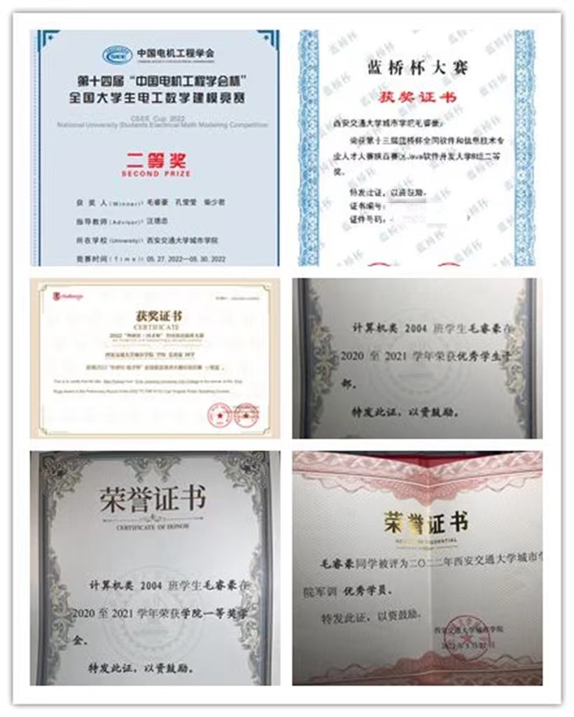 在数学建模竞赛中毛睿豪自学了Matlab,Lingo与Python语言,还作为队长,带领团队参与多个国内外比赛,在第十四届“中国电机工程学会杯”全国大学生电工数学建模竞赛中获得国家二等奖,2021学年全国大学生数学建模竞赛获陕西省二等奖。
