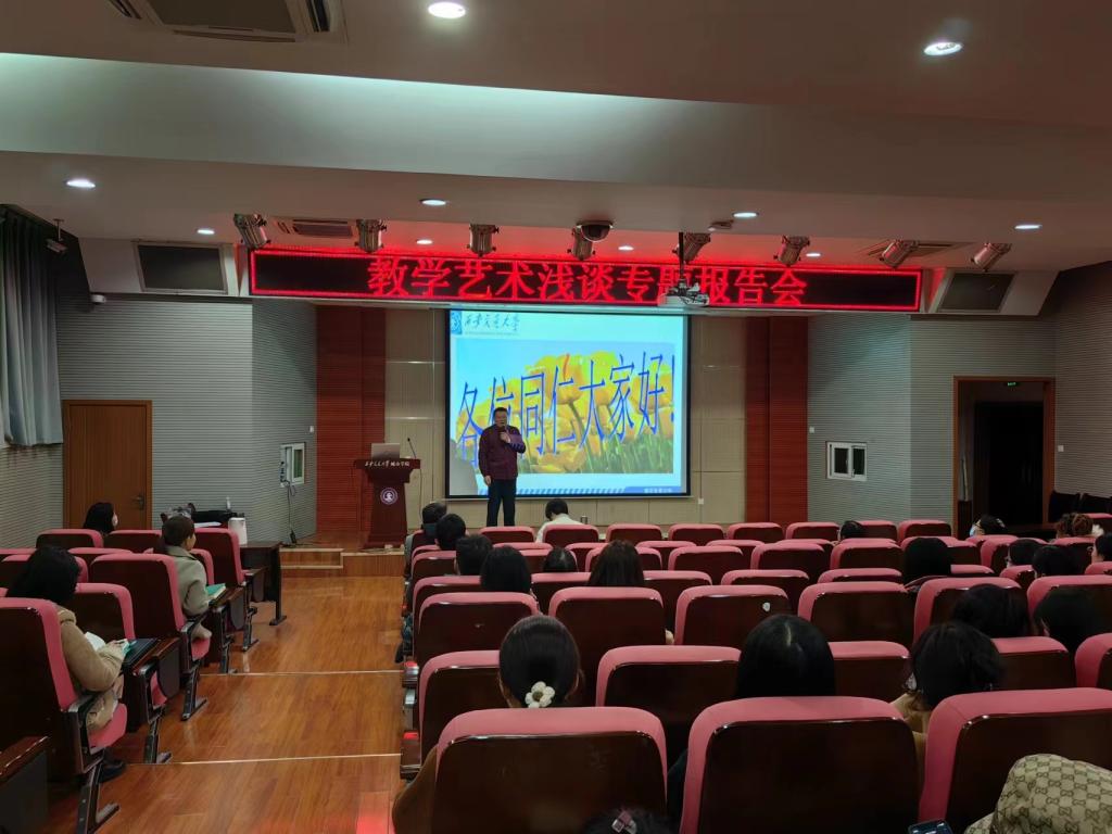 唐玉海教授结合自身授课经验,以“教学艺术浅谈”为主题,从教态、课前导入、讲授、组织、板书、结尾等六方面对教学艺术进行了深入讲解,理论联系实际,帮助教师们梳理了教学艺术的内涵,并通过举例子的方法从实践角度为教师们展示了实际教学情境中具体的运用,参会教师们纷纷表示获益匪浅。
