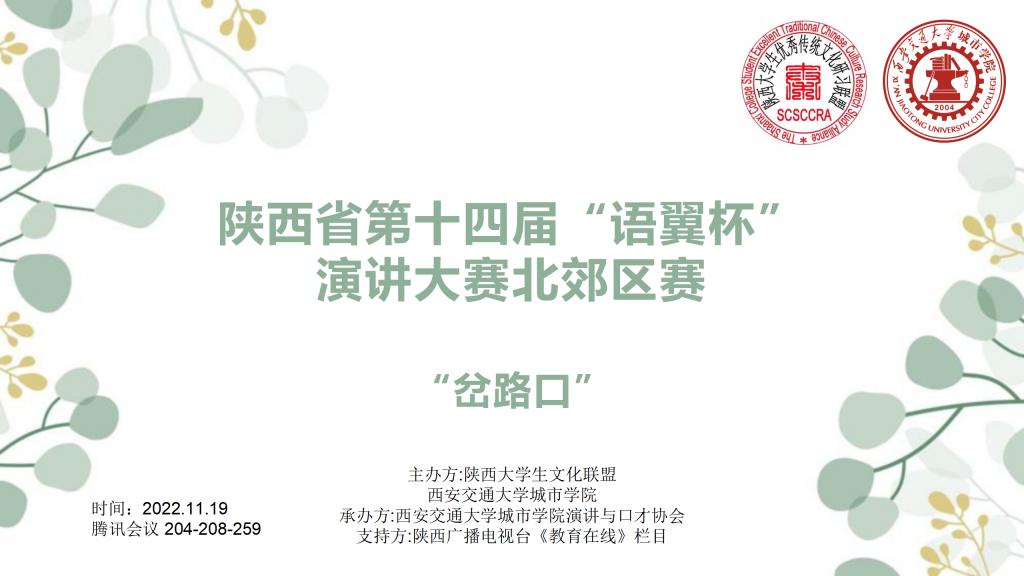本届“语翼杯”演讲比赛通过线上演讲的形式在全省高校内举行,旨在引导青年大学生在当经政治形态下树立正确的爱国主义精神,丰富大学生在校的课余生活,活跃校园气氛,开拓学生思维,以充分体现大学生朝气蓬勃、积极向上的乐观心态;为了赋予青年人更多展示自我的机会,给予青年人更好的交流平台,培养新一代优秀的社会主义接班人。以“岔路口”为主题,尽情发挥参赛选手的自身风采、主张观点及演讲才能。