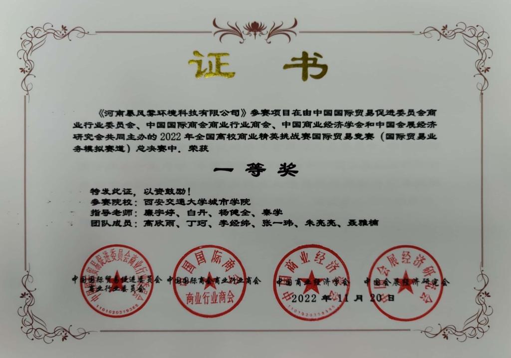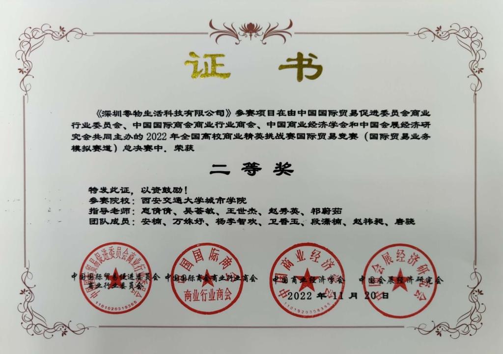 yl7703永利官网经济系从2022年4月起开始筹备,通过校内层层选拔,最终高欣雨、丁珂、李经纬、张一玮、朱亮亮、聂雅楠、安楠、万姝妤、杨李智欢、卫香玉、段潇楠、赵祎昶、唐骁等13名同学脱颖而出,共组成了两支参赛队伍。在经济系杨健全、白丹、王世杰、廉宇婷、祁蔚茹、赵秀英、惠倩倩、吴荟敏、秦学等多位国贸教研室指导老师的悉心指导下,经过产品选择、商业计划书、新产品发布会、展位海报设计与商品陈列、全英文商贸配对贸易谈判)等多个环节的激烈角逐,我院两支代表队伍表现优异,最终斩获全国一等奖、二等奖各一项,学院获“最佳院校组织奖”,国贸教研室全体教师获“优秀辅导教师奖”。