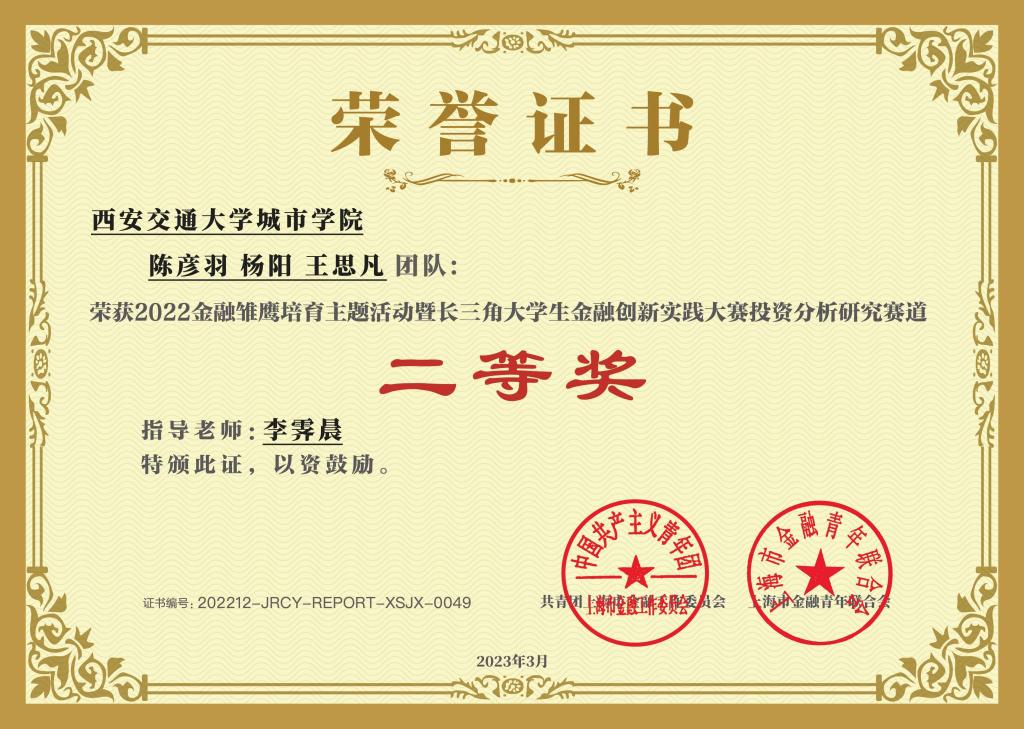 历时半年时间,由共青团上海市金融工作委员会、上海市金融青年联合会主办,东方财富信息股份有限公司承办的2022年金融雏鹰培育主题活动暨大学生金融创新实践大赛于3月落幕。本届大赛采用“基金模拟投资”“投资分析研究”双赛道形式。yl7703永利官网经济系从2022年9月开始便积极通过线上线下同步宣传推广,以培养学生金融实践能力为目标,组织学生积极参与,经过初赛、复赛等环节的角逐,在教师和学生的共同努力下,在“投资分析研究”赛道,由李霁晨老师担任指导教师,陈彦羽、杨阳及王思凡团队完成的《格力电器投资分析报告》荣获国家级二等奖。