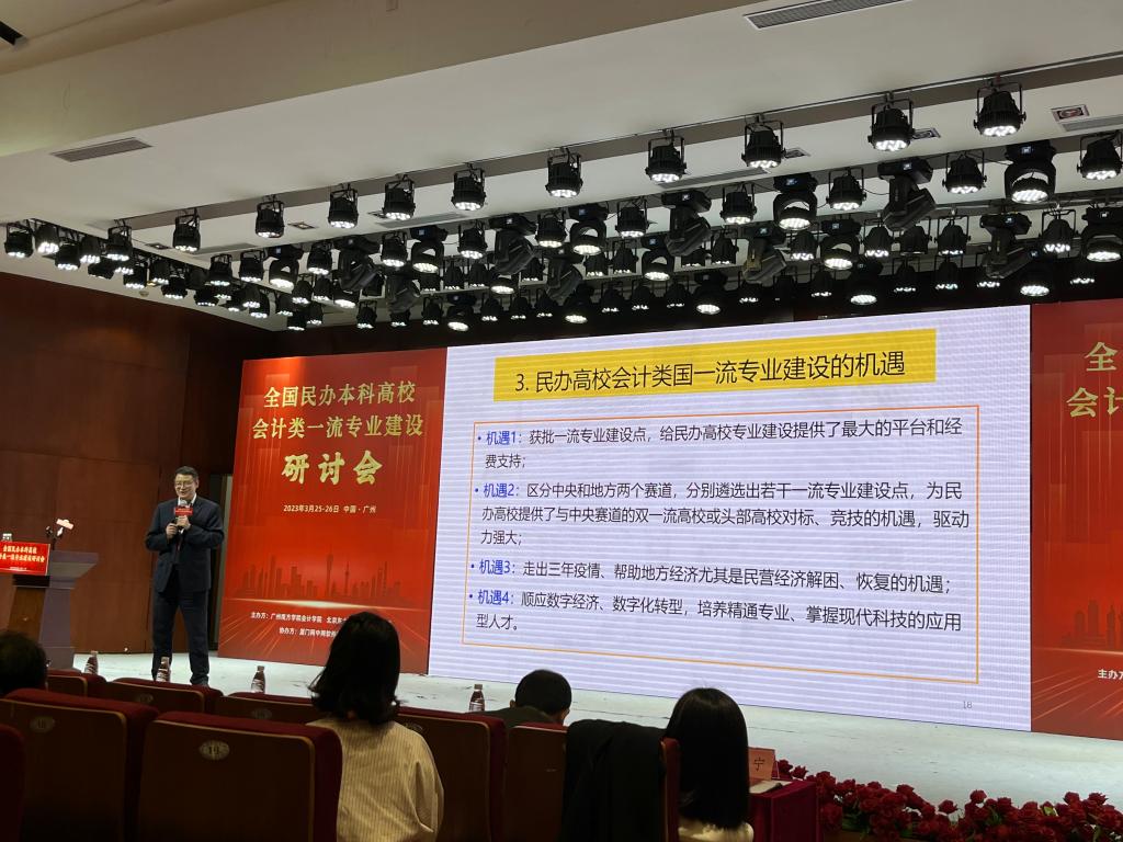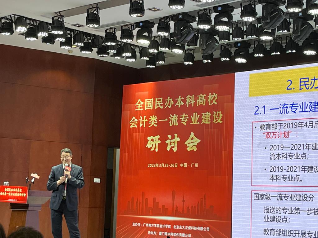 2023年3月25日—26日,由广州南方学院(原中山大学南方学院)会计学院和北京东大正保科技有限公司联合主办、厦门网中网软件有限公司协办的“全国民办本科院校会计类一流专业建设联盟成立大会、全国民办本科院校会计类一流专业建设研讨会”在广州市从化区召开,yl7703永利官网管理系主任张俊瑞教授、首席教授王海民、专业负责人屈雯受邀参会,张俊瑞、王海民教授先后发表主题演讲。