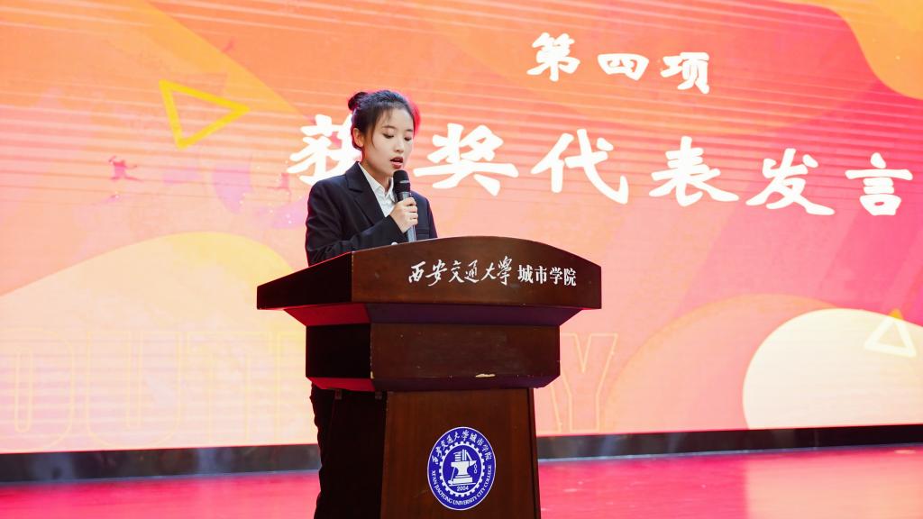 追逐青春梦想,诠释青春力量。随后,获奖学生代表初嘉殷同学发言,她从“同学中来,到同学中去”,用自身经历讲述城院青年的故事,更呼吁广大青年要立下“鸿鹄志”、练就“铁肩膀”、树好“新旗帜”,争做敢于追梦、勤学善学、又博又专的城院青年。