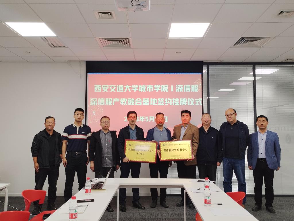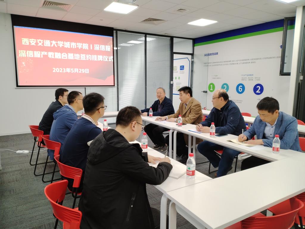 学院一行在深信服科技股份有限公司陕西办事处行业总经理席鹏、产教融合基地(陕西)总经理李清毅、陕西办事处教育行业经理高振坤、陕西产教融合基地讲师张湛翔的陪同下参观了深信服产教融合基地。席鹏总经理介绍了公司情况及陕西区域业务情况,朱旭副院长介绍了学院的办学情况;随后,校企双方就人才培养、产教融合、平台共建等方面进行了深入的探讨和交流;最后,校企双方举行了“教育部供需对接就业育人项目合作单位”的揭牌仪式。