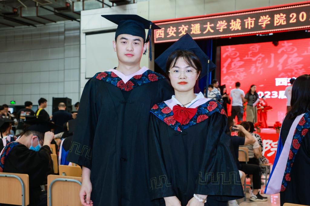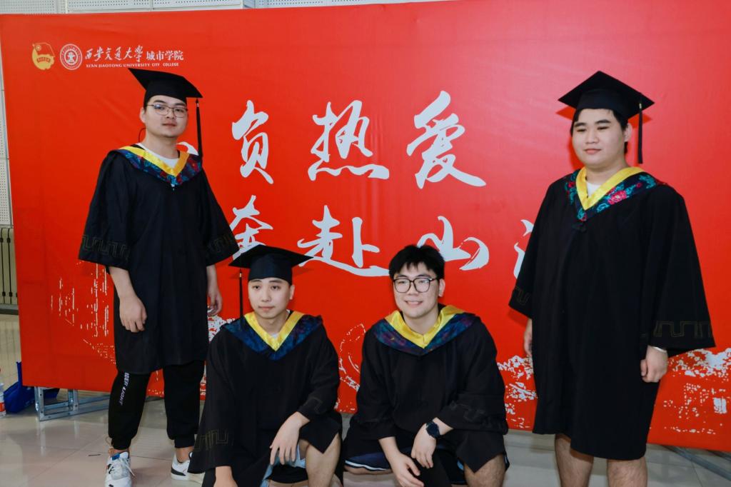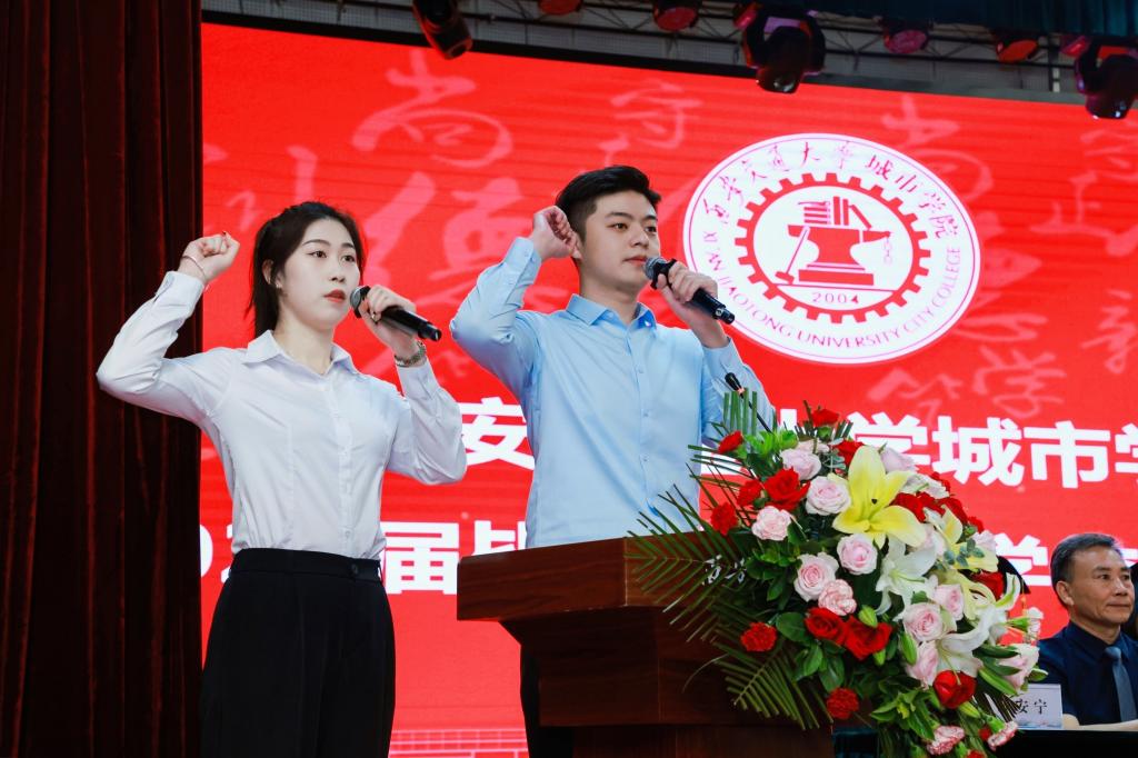 在管理系工商191班杨斯民同学、外语系英语194班郗悦靓同学的带领下,全体毕业生集体进行宣誓:铭记尚德笃学,坚持守正创新;感恩父母养育,谨遵师长教诲;勇担时代使命,争做社会精英;肩负公民责任,报效祖国人民;为国家繁荣富强努力奋斗,让明日的交大城院以我为荣!毕业生们声音洪亮,场面庄严而隆重。