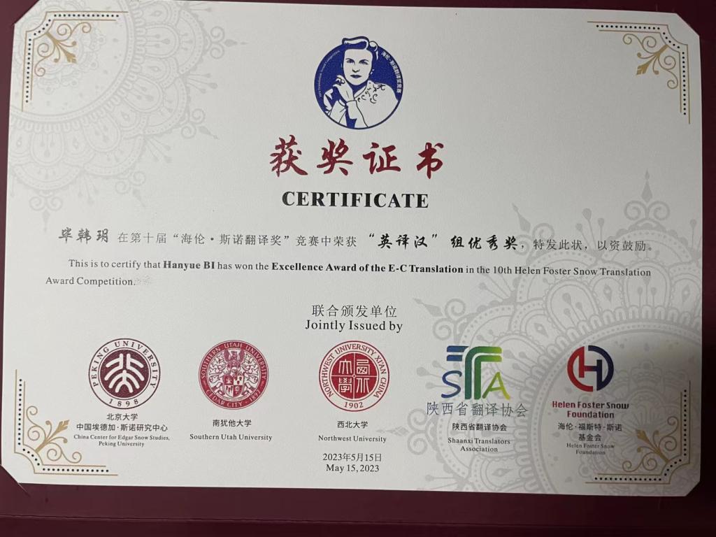 据悉,第十届“海伦·斯诺翻译奖”由陕西省翻译协会、北京大学中国埃德加·斯诺研究中心、南犹他大学(美国)、西北大学和海伦·福斯特·斯诺基金会联合主办,西北大学外国语学院承办。本届大赛共收到有效稿件758份,经过初评和复评,最终54人获奖。