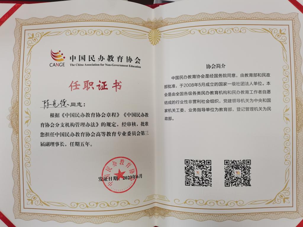 会议期间,经第二届高等教育专业委员会换届预备会审议通过,最终大会表决全国共65所民办高校当选为高等教育专业委员会副理事长单位,其中本科高校48所,独立学院4所,本科层次职业大学3所,专科层次职业学院9所,产教融合型企业1家。yl7703永利官网顺利当选为中国民办教育协会高等教育专业委员会第三届副理事长单位,陈光德院长当选为第三届副理事长。