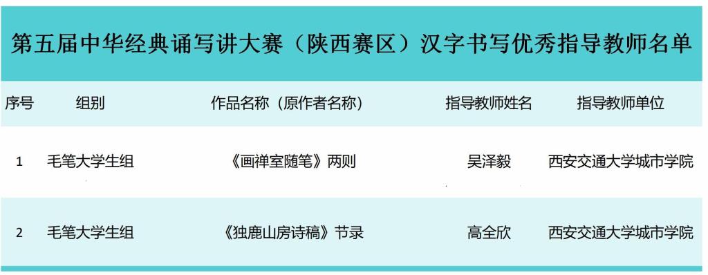 2023年7月,学院参加了由教育厅组织的全国第五届中华经典诵写讲大赛。经过遴选优秀作品参赛、省级评审,学院在该大赛中获一等奖3项,二等奖5项,优秀指导教师2名。艺术系学生成小兰、李缓获汉字书写作品一等奖,艺术系学生韩浩天、李烨、万嘉乐、杜珂薇获汉字书写作品二等奖;艺术系高全欣老师获汉字书写作品一等奖,吴泽毅老师获汉字书写作品二等奖。吴泽毅、高全欣两位老师获得汉字书写优秀指导教师奖。