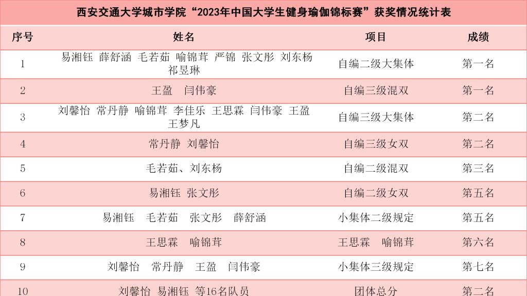 10月19日,2023年中国大学生健身瑜伽锦标赛在河北省张家口市崇礼冬奥运会小镇落下帷幕。我校首次参赛,16名队员一举斩获2项第一名、2项第二名、1项第三名、2项第五名、1项第六名、1项第七名的成绩,并获得甲组团体总分第二名。