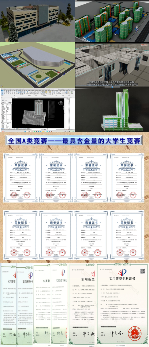 土木建筑工程学院教学团队在专业理论课程教学基础上,开发了“BIM设计创新实验”课程,设置了“土建施工BIM建模与应用”“机电BIM建模与应用”“装配式建筑BIM设计与建造”“BIM全过程造价管理与应用”等十个实验模块,初步构建了“基本素养—基本技能—综合设计—创新应用”的模块化、层次式实验教学创新体系。以创新实验为支撑,以BIM信息化应用能力提升为目标,土木建筑工程学院学生参加科技创新活动的氛围日益浓厚,学生的应用型创新能力得到了良好的锻炼。近两年,共100余人参加了各级各类科技创新活动,获得了包括全国高校BIM毕业设计创新大赛一等奖在内的各类学科竞赛奖项40余项,授权实用新型专利12项。