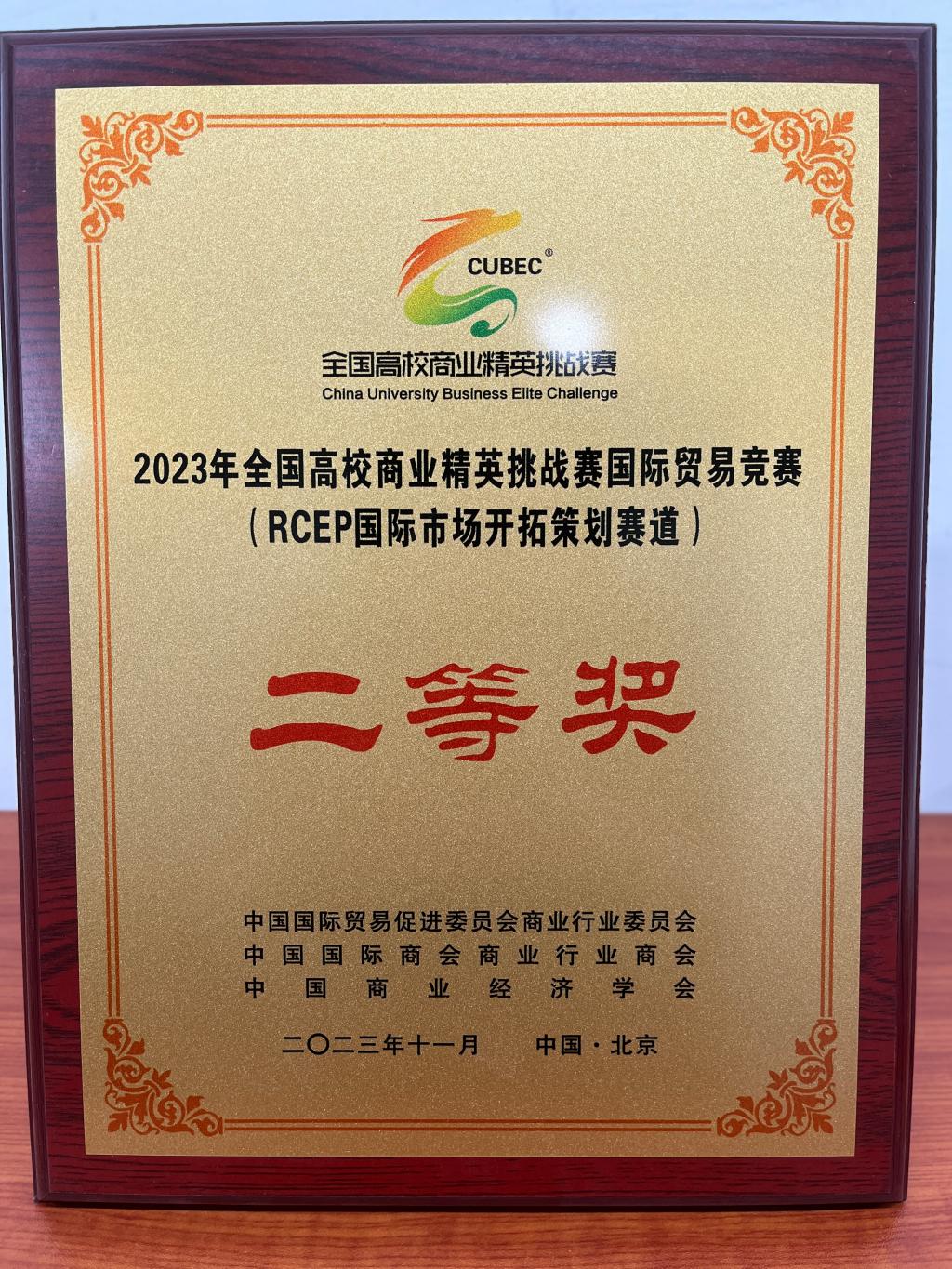 2023年11月,由中国国际贸易促进委员会商业行业委员会、中国国际商会商业行业商会和中国商业经济学会主办全国高校商业精英挑战赛国际贸易竞赛(RCEP赛道)全国总决赛举办。该竞赛于2021年起纳入中国高等教育学会发布的学科竞赛排行榜目录。本次比赛由个人知识赛和团体总决赛两个环节构成,既考察参赛选手的相关知识储备,又考察团队协作能力、实践运用能力。