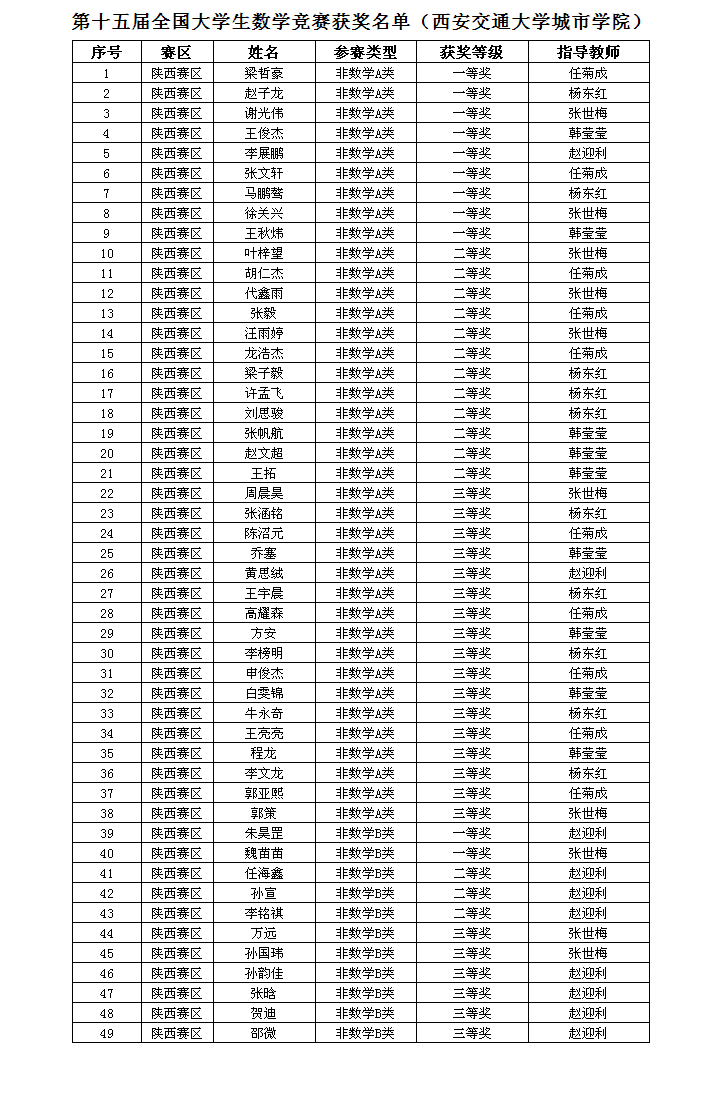 近日,第十五届全国大学生数学竞赛成绩揭晓,我校师生再创佳绩,共获奖34项,其中陕西赛区一等奖11项、二等奖15项、三等奖23项。