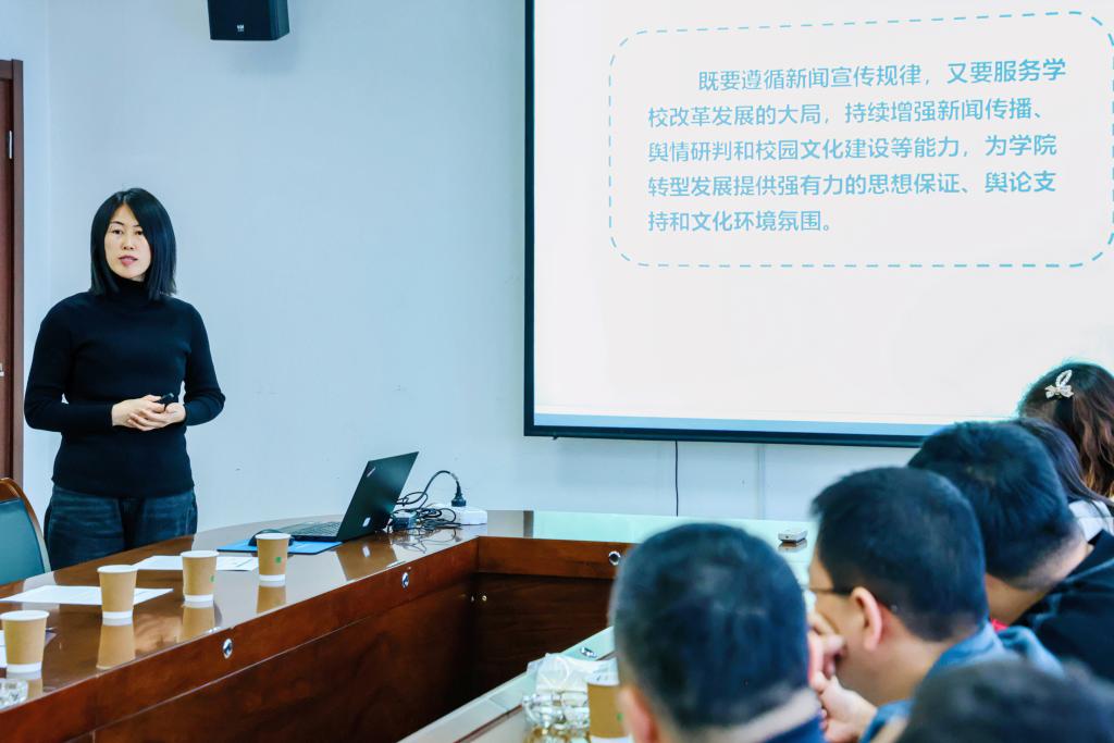 党校办公室副主任李静从新闻宣传、新媒体建设、信息报送、网络舆情监测、网络文明建设、宣传阵地管理、宣传队伍建设、宣传工作制度化等方面对2023年学校宣传工作进行了总结,并就2024年宣传工作要点进行了汇报。2024年,学校将坚持内容为要,讲好校园故事;打造全媒体矩阵,实现内容多元化传播;推进体制机制创新,构建“大宣传”格局;做好学校20周年校庆的宣传报道。