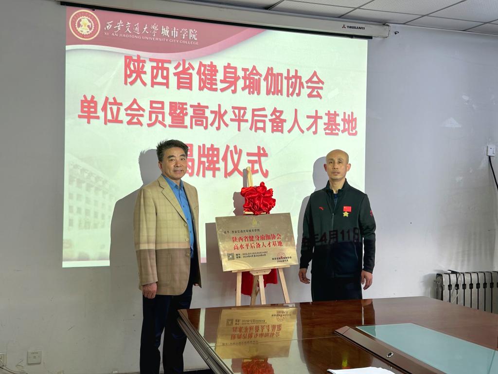 会后,朱旭副校长与于巴锁副主席共同为“陕西省健身瑜伽协会单位会员”和“陕西省健身瑜伽协会高水平后备人员人才基地”揭牌。