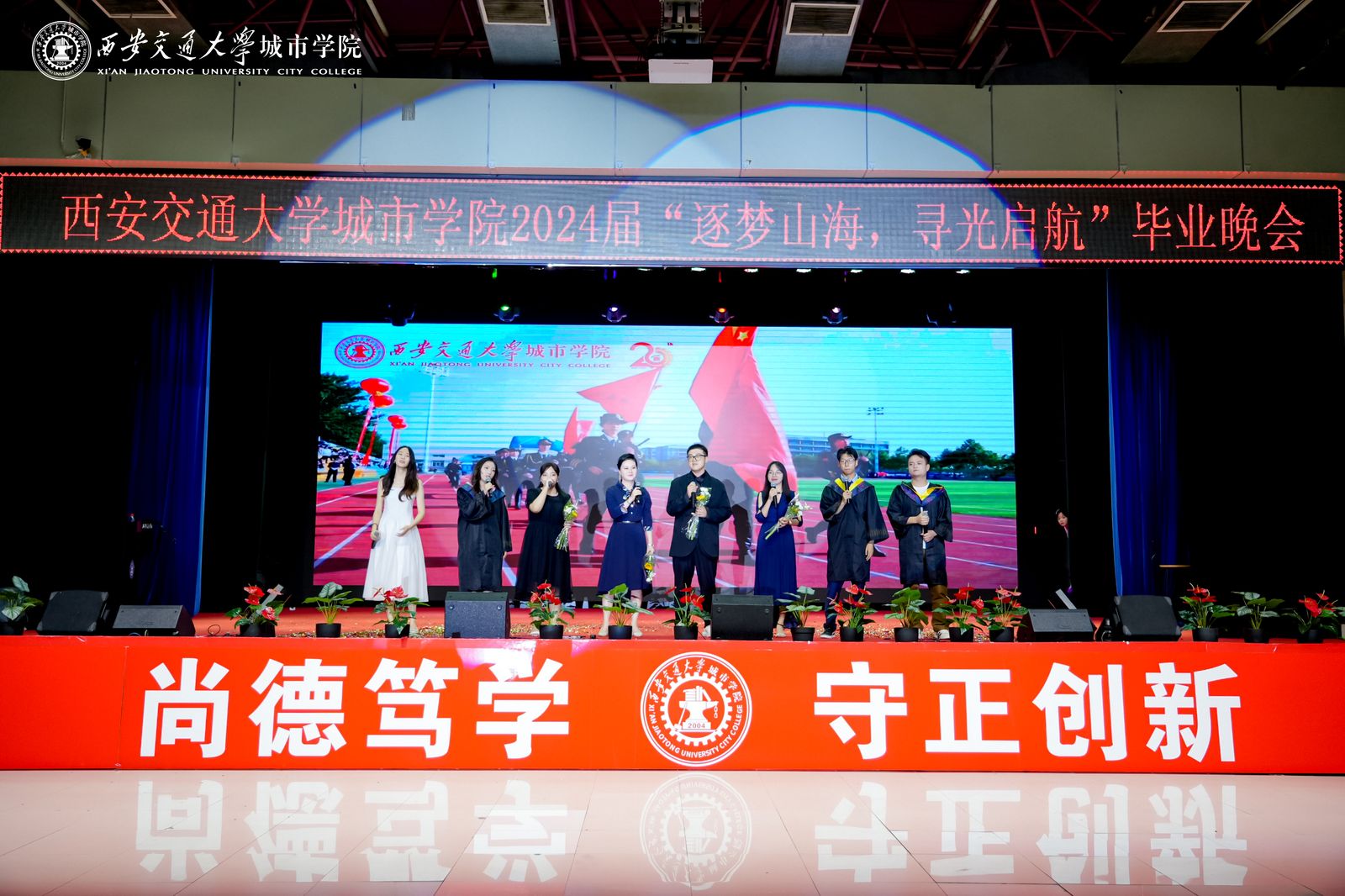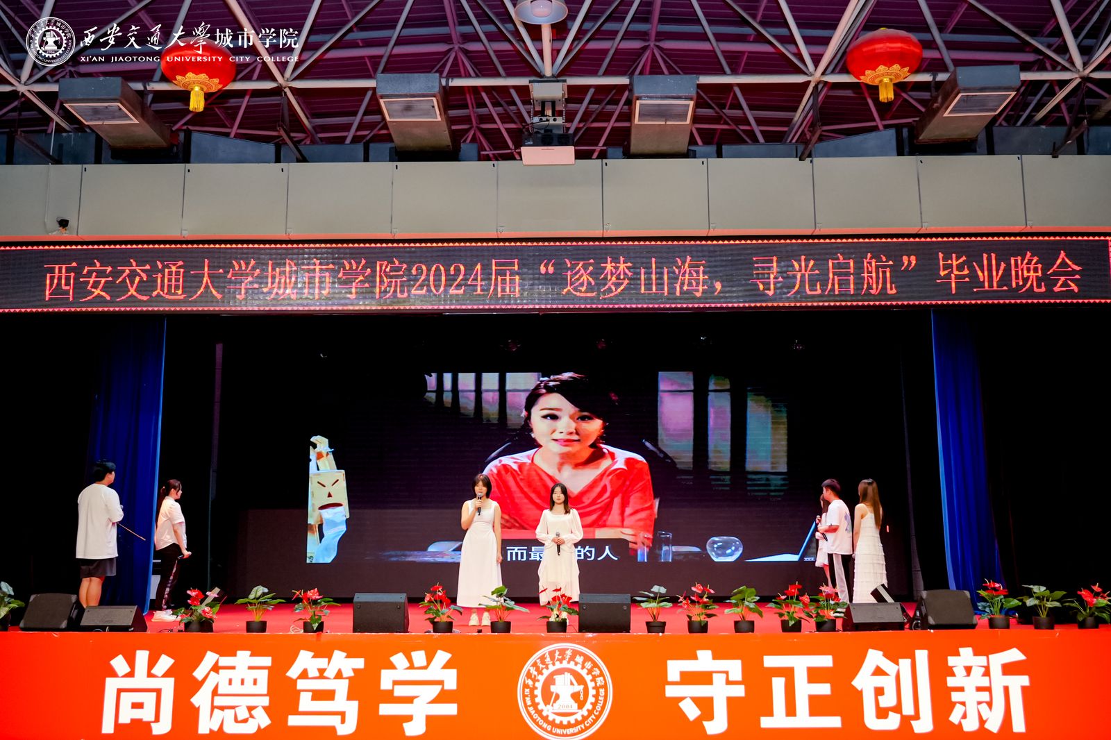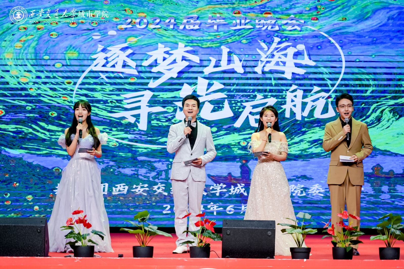为欢送2024届毕业生,用歌舞表达对毕业生的美好祝福和期望,将四年最美的青春记忆定格在城院校园里,学校于6月24日晚在大学生活动中心举办“逐梦山海,寻光启航”2024届毕业晚会。校长陈光德,党委书记张爱萍,副校长朱旭,副校长岳华海及各二级学院(教学部)、处(室)负责人和2024届毕业生、城院学子代表们参加本场晚会。传媒学院教师高宇、护理与康复学院辅导员路凡、2024届毕业生罗兰、崔雨婷担任主持人。