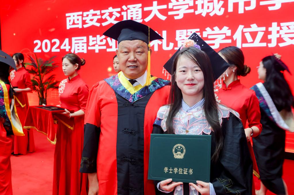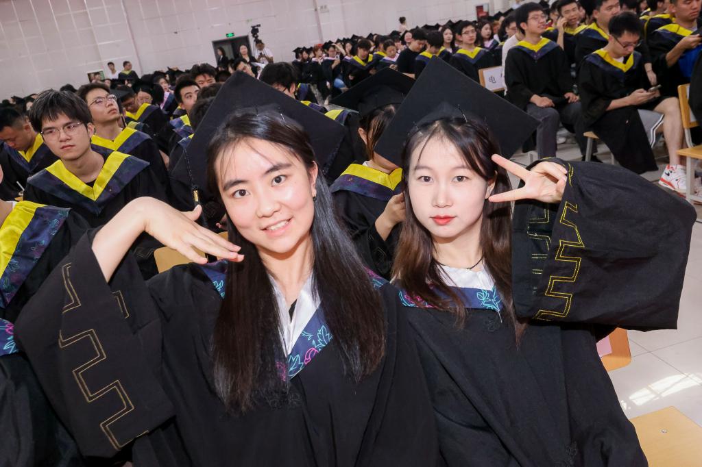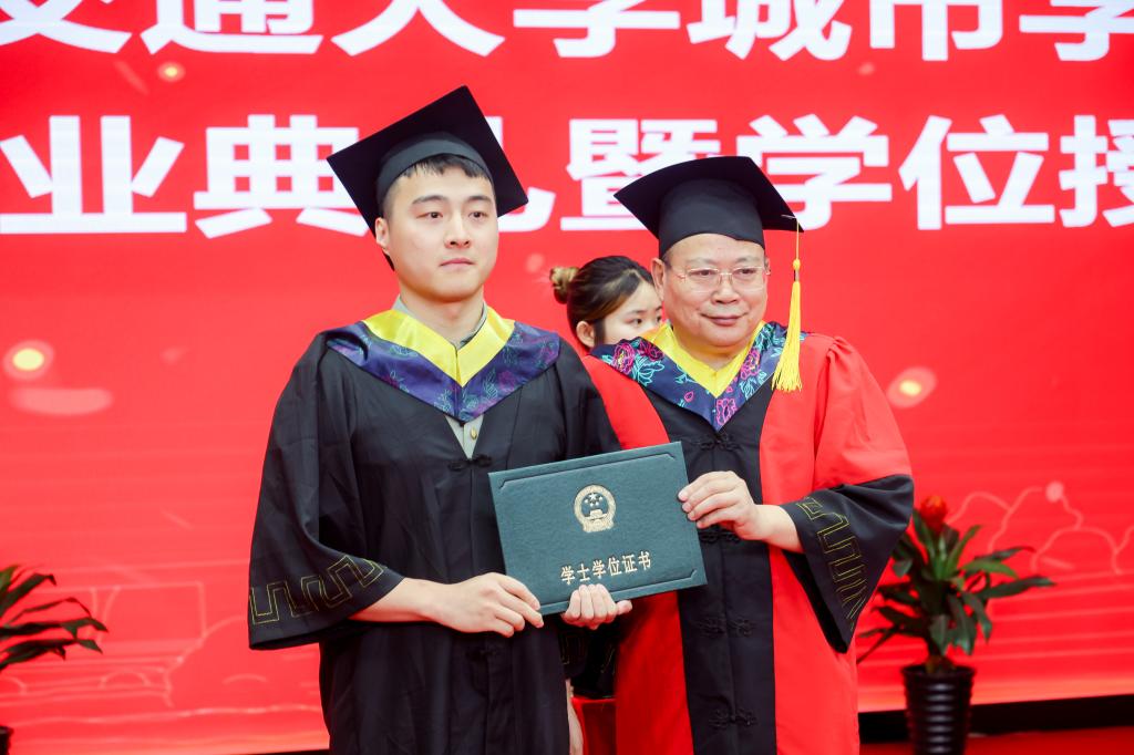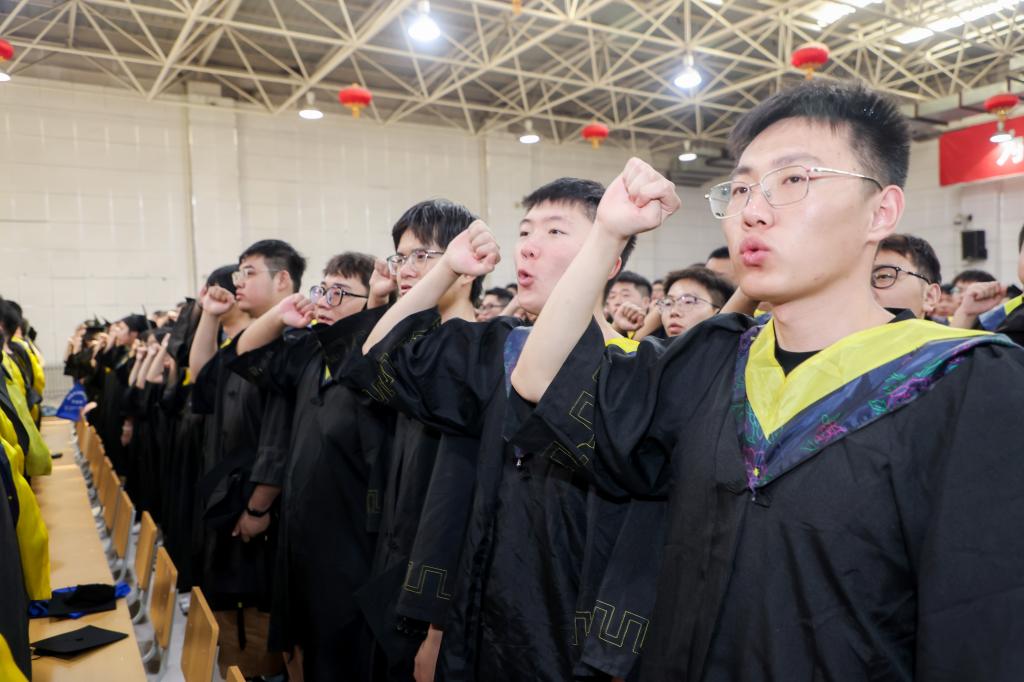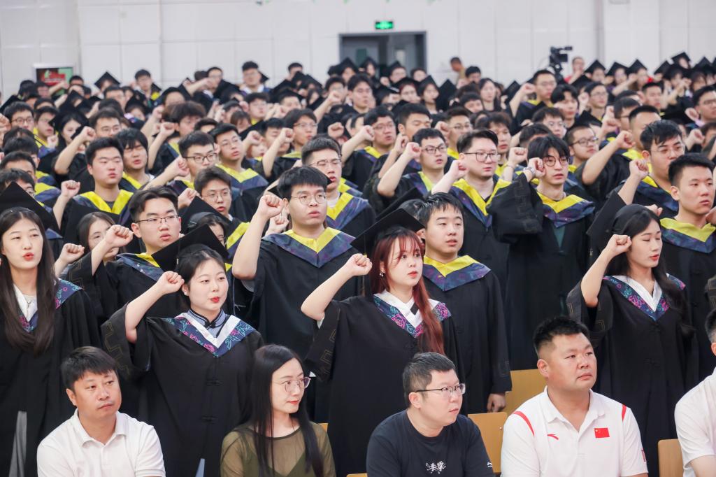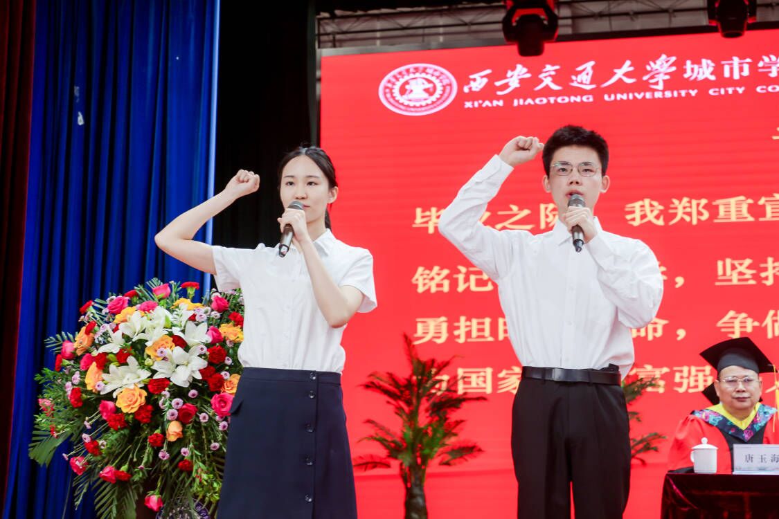 在机械工程学院机制2002过旭晗,英语2001班徐高一铭同学的带领下,全体毕业生集体进行宣誓:铭记尚德笃学,坚持守正创新;感恩父母养育,谨遵师长教诲;勇担时代使命,争做社会精英;肩负公民责任,报效祖国人民;为国家繁荣富强努力奋斗,让明日的交大城院以我为荣!毕业生们声音洪亮,场面庄严而热烈。