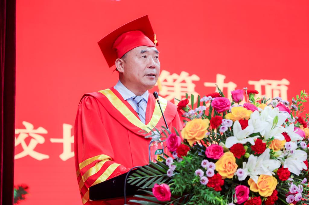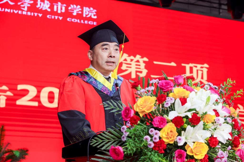 陈光德校长发表了深情的讲话,他与毕业生们一起回顾了大学四年里特殊的体验和难忘的记忆,一同梳理了大学期间的点滴收获、成长和遗憾。在2024届毕业生即将踏出校门走上社会之际,他提出了几点希望与同学们共勉:希望大家要立志高远,勇于担当;要脚踏实地,不尚空谈;要终身学习,持续赋能;要坚定意志,直面挑战。希望大家趁理想炙热滚烫,趁激情在胸中激荡,趁拥有无限活力与能量,让理想发生,让未来成长,让梦想照进现实!母校将永远关注大家、支持大家,愿意分享大家的喜悦、分担大家的风雨,城市学院永远是毕业生们最温暖的家园。在毕业生们即将开启人生新征程之际,他衷心地祝福2024届毕业生们事业有成,前程似锦!