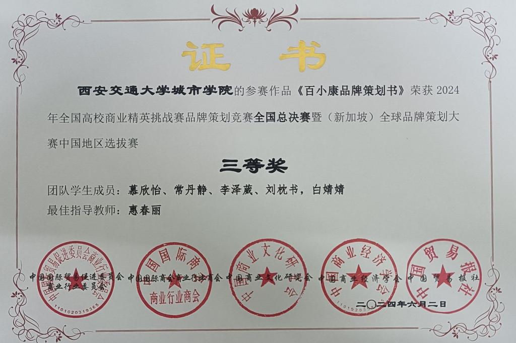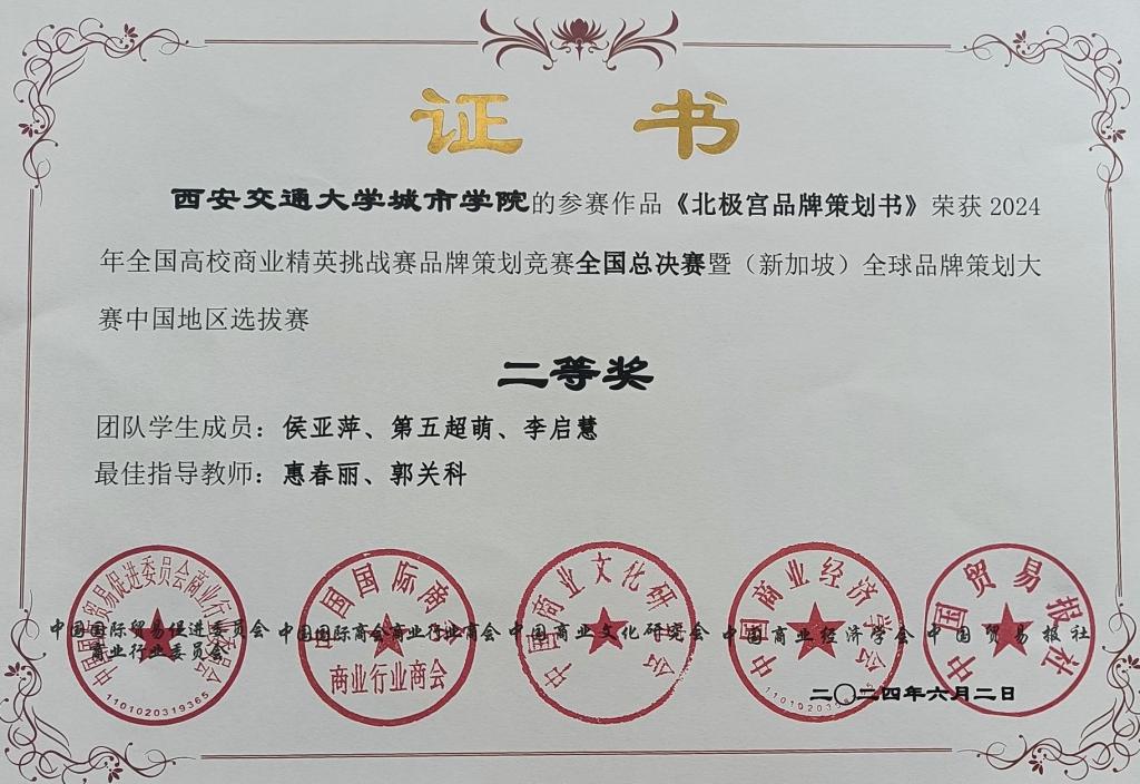 2023年12月竞赛启动以来,管理学院充分动员,精心组织,历经知识赛、校赛、全国总决赛预选赛等环节,三支队伍获得全国总决赛资格。参赛团队选择真实存在的产品或服务品牌为策划对象,从品牌现状、品牌元素和定位、品牌核心价值、品牌推广和传播、品牌资产保护等方面撰写品牌策划书,总决赛采取提交品牌策划书、品牌策划方案陈述和实时答辩的方式进行,经过紧张的陈述和答辩,我校参赛的三支队伍获得全国二等奖二项,全国三等奖一项,产学合作企业陕西北极宫生物科技集团有限公司和陕西百康实业集团有限公司分别获得产教融合项目优秀企业奖。