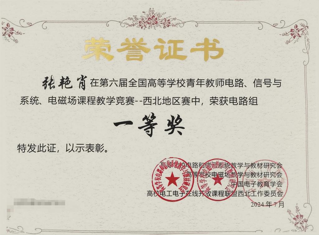 2024年6月,第六届全国高等学校青年教师电路、信号与系统、电磁场课程教学竞赛西北地区赛在西安电子科技大学举行,比赛共吸引了来自西北地区30多所高校教师报名参赛。我校电气信息学院电气工程系教师张艳肖精心准备、积极参赛,在赛场上与众多985、211高校教师同场竞技,运用多元化的教学方法和手段,将原本枯燥生涩的电路课程内容以生动、直观、富有感染力的方式呈现给评委与观摩师生,得到评委们一致肯定,最终获得电路课程组一等奖。