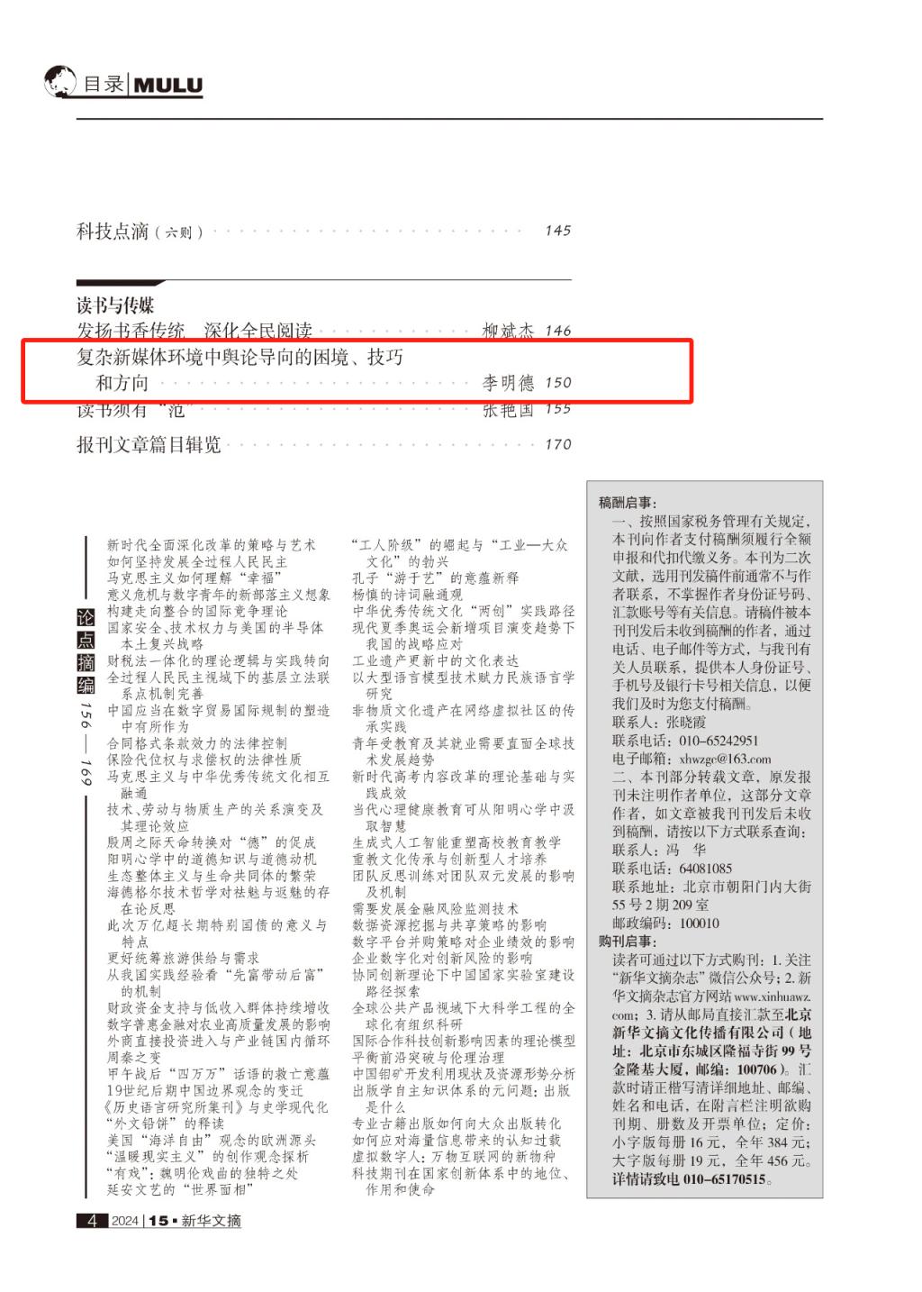 近日,传媒学院院长李明德教授以我校为第一单位在《新媒体与网络》创刊号上发表的论文《复杂新媒体环境中舆论导向的困境、技巧和方向》被《新华文摘》2024年第15期全文转载。这篇文章不仅是我校建校以来首次被《新华文摘》全文转载的学术成果,也是李明德教授个人第五篇被《新华文摘》全文转载的学术论文。