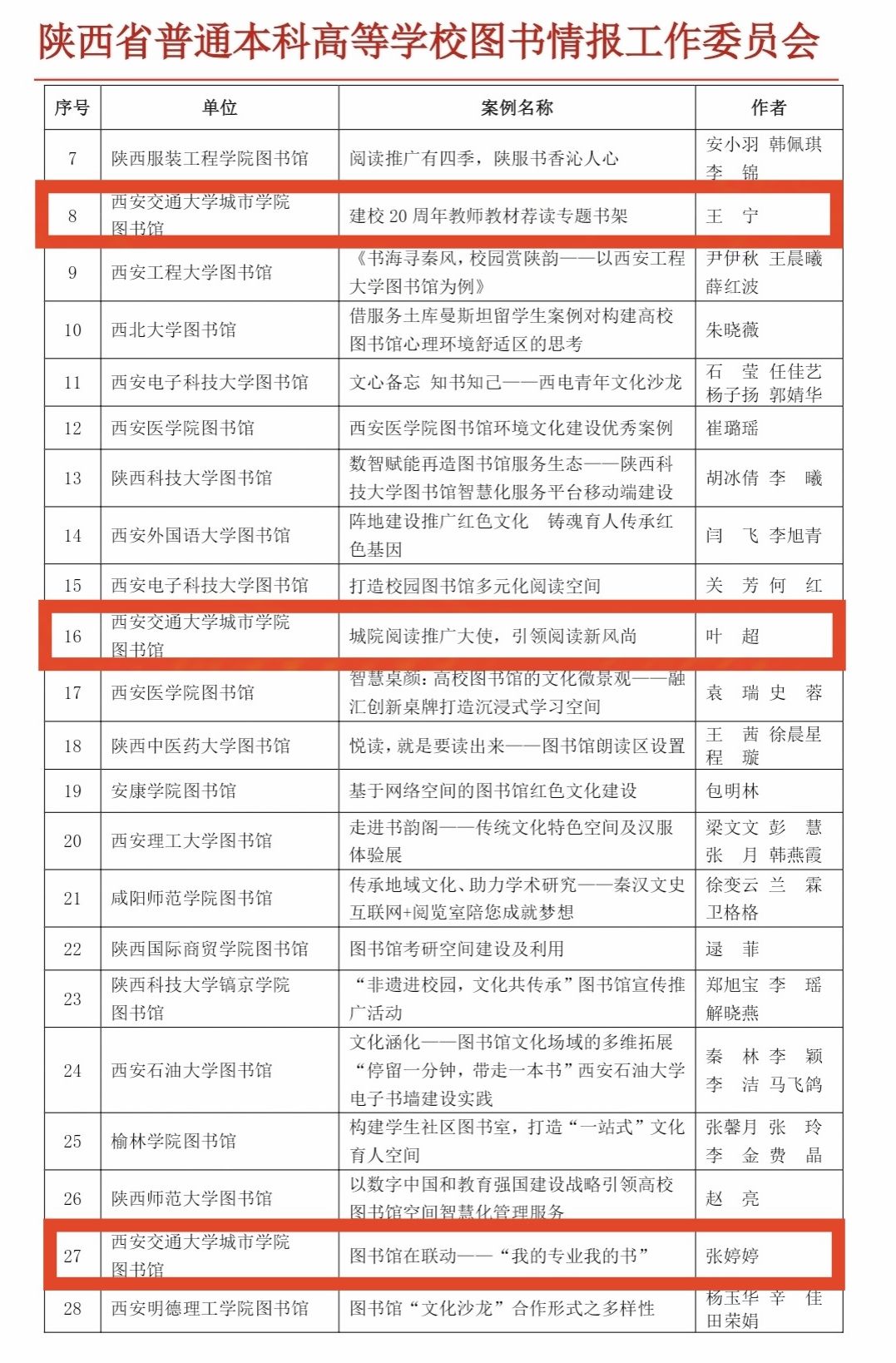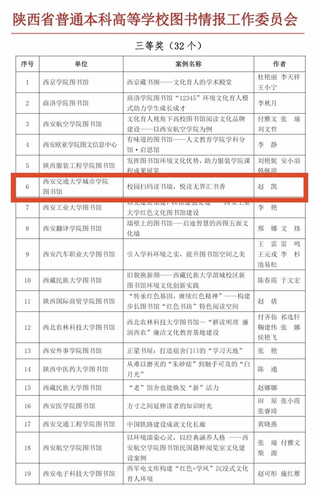 近日,由陕西高校图书情报工作委员会主办的“陕西高校图书馆环境文化建设案例征集与评选活动”圆满落幕。此次评选活动汇聚了包括西北工业大学、西安电子科技大学、西北大学等在内的36所省内高校的图书馆,共提交了114个建设案例。经过严格的专业评审与层层筛选,yl7703永利官网图书馆提交的“校园扫码读书墙,悦读无界汇书香”案例凭借其创新性、实用性和广泛的参与度获得三等奖。此外,“建校20周年教师教材荐读专题书架”“城院阅读推广大使,引领读书新风尚”以及“图书馆在联动——‘我的专业我的书’”三个案例均获得优秀奖。