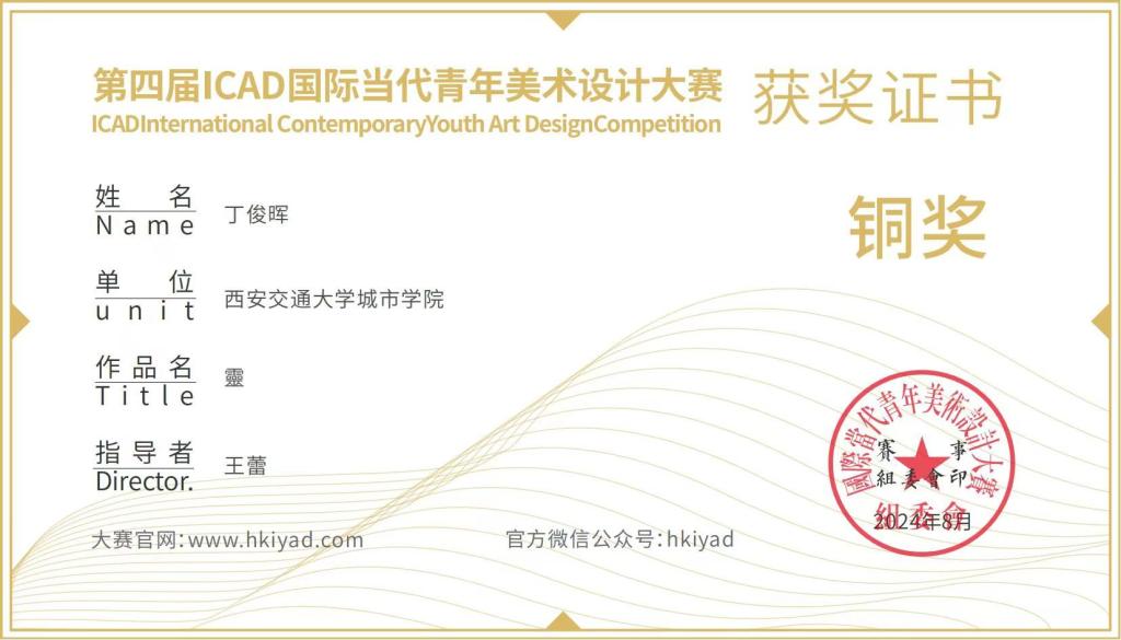在近期揭晓的第四届“ICAD国际当代青年美术设计大赛”(International Contemporary Youth Art Design Competition)中,我校艺术与设计学院学生丁俊晖同学的作品《灵》以其独特的艺术视角、深刻的主题表达以及精湛的设计技巧,在众多参赛作品中脱颖而出,赢得了评委们的一致好评,最终摘得铜奖,为学校在国际艺术设计领域赢得荣誉。