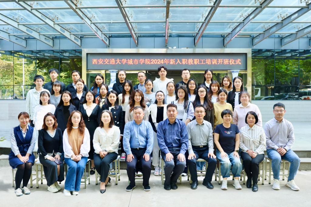 开班仪式结束后,学校领导与新入职教职工在行政楼下合影留念。