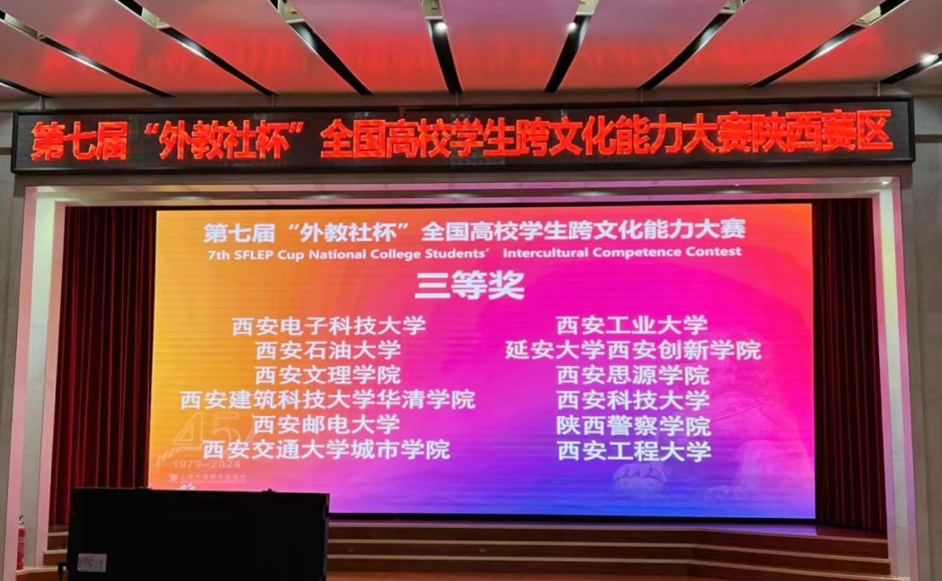 近日,第七届“外教社杯”全国高校学生跨文化能力大赛陕西赛区比赛在陕西师范大学落幕。经过激烈角逐,我校选派的学生代表队凭借出色的表现获省级三等奖。