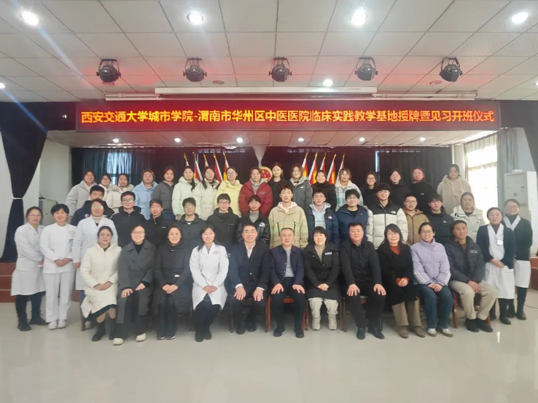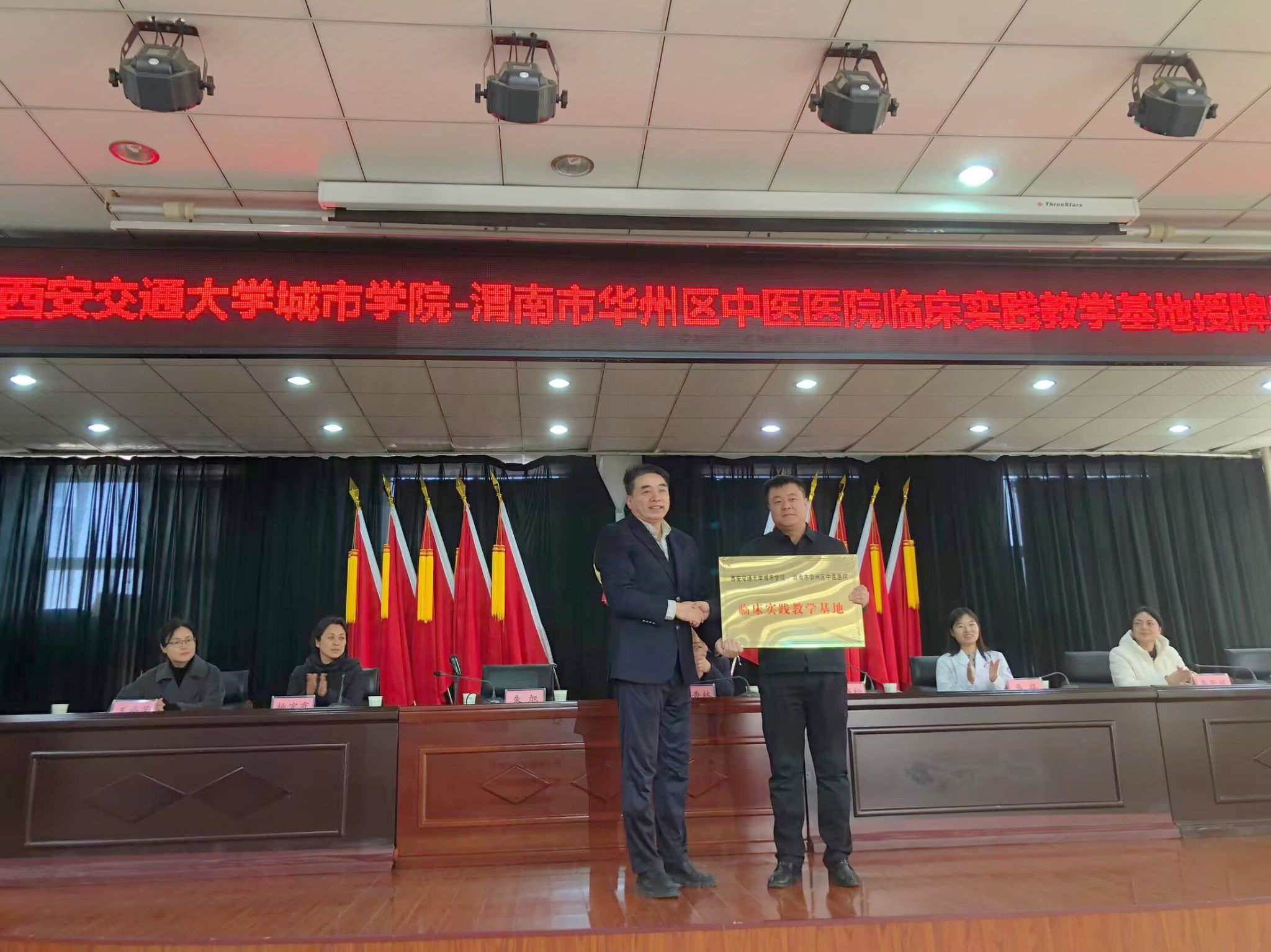 渭南市华州区中医医院党委书记孙香林致辞,他就医院发展概况、学科建设和重点专科进行了简要介绍。孙书记表示,医院见习作为连接理论和临床实践的桥梁,为学生搭建了一个学习与交流的宝贵平台,希望各位学员将医院当成一个温暖的大家庭,以良好的心态适应医院环境,以满腔的热忱投入见习生活,在见习学习中遇到问题要多问、多思、多请教,明确个人目标,锤炼真本领,成为有理想、有抱负、能吃苦、肯奋斗的医学薪火传承人。朱旭副校长与徐海松院长为“yl7703永利官网-渭南市华州区中医医院临床实践教学基地”授牌。