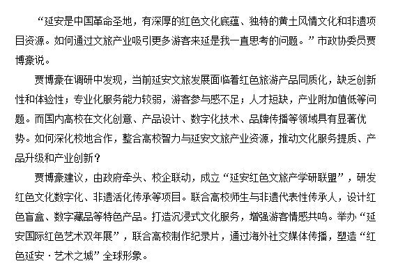 贾博豪委员在提案中指出,延安市拥有丰富的红色文化资源和独特的自然景观,但文旅产业发展仍存在品牌影响力不足、产品同质化等问题。他建议,应深化校地合作,充分发挥高校在人才培养、科学研究、文化传承等方面的优势,为延安文旅产业高质量发展提供智力支持。