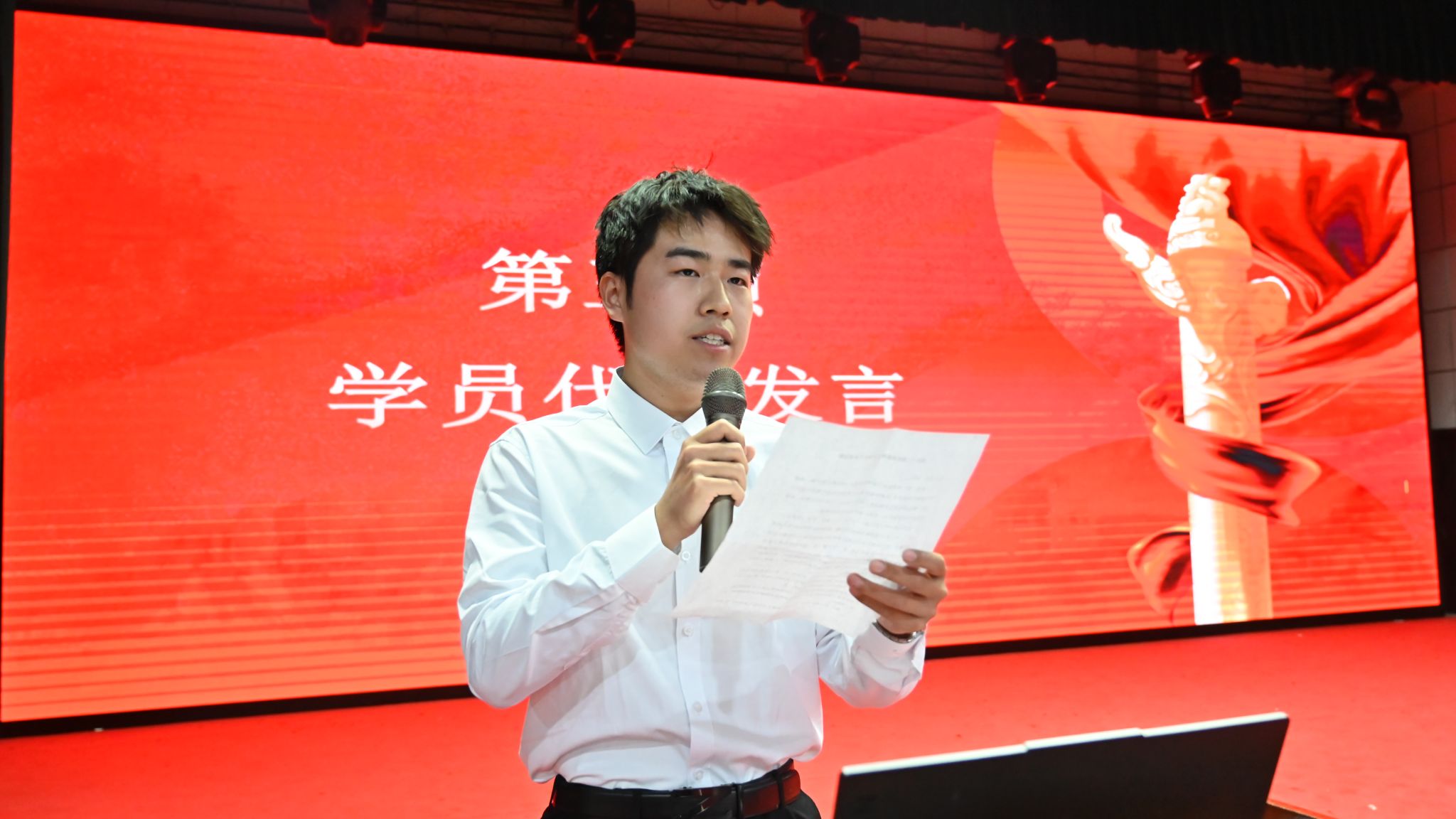 开班典礼在庄严的国歌声中拉开帷幕。辛红伟处长详细介绍了本期培训班的教学安排,从课程设置、教学方式到考核标准,使学员们清晰了解培训规划,明确学习目标,为后续学习筑牢基础。会计2404班赵梓越同学作为学员代表发言。他代表全体学员郑重承诺,将以“端正作风”正动机,以“空杯心态”学理论,以“对标意识”找差距,以“实干作风”促转化,积极提升自我,向党组织靠拢,为党和国家事业贡献力量。