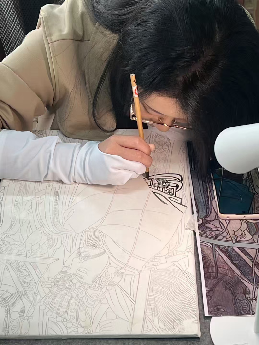 她最喜欢上的是绘画课里的壁画临摹,当时他们临摹的是山西永乐宫壁画,临摹时用泥板作画,给矿物质颜料加胶、调色粉,进行沥粉堆金、做旧等一系列工艺处理,她由衷感叹古人的鬼斧神工和匠心神韵,感慨中华文化的博大精深。