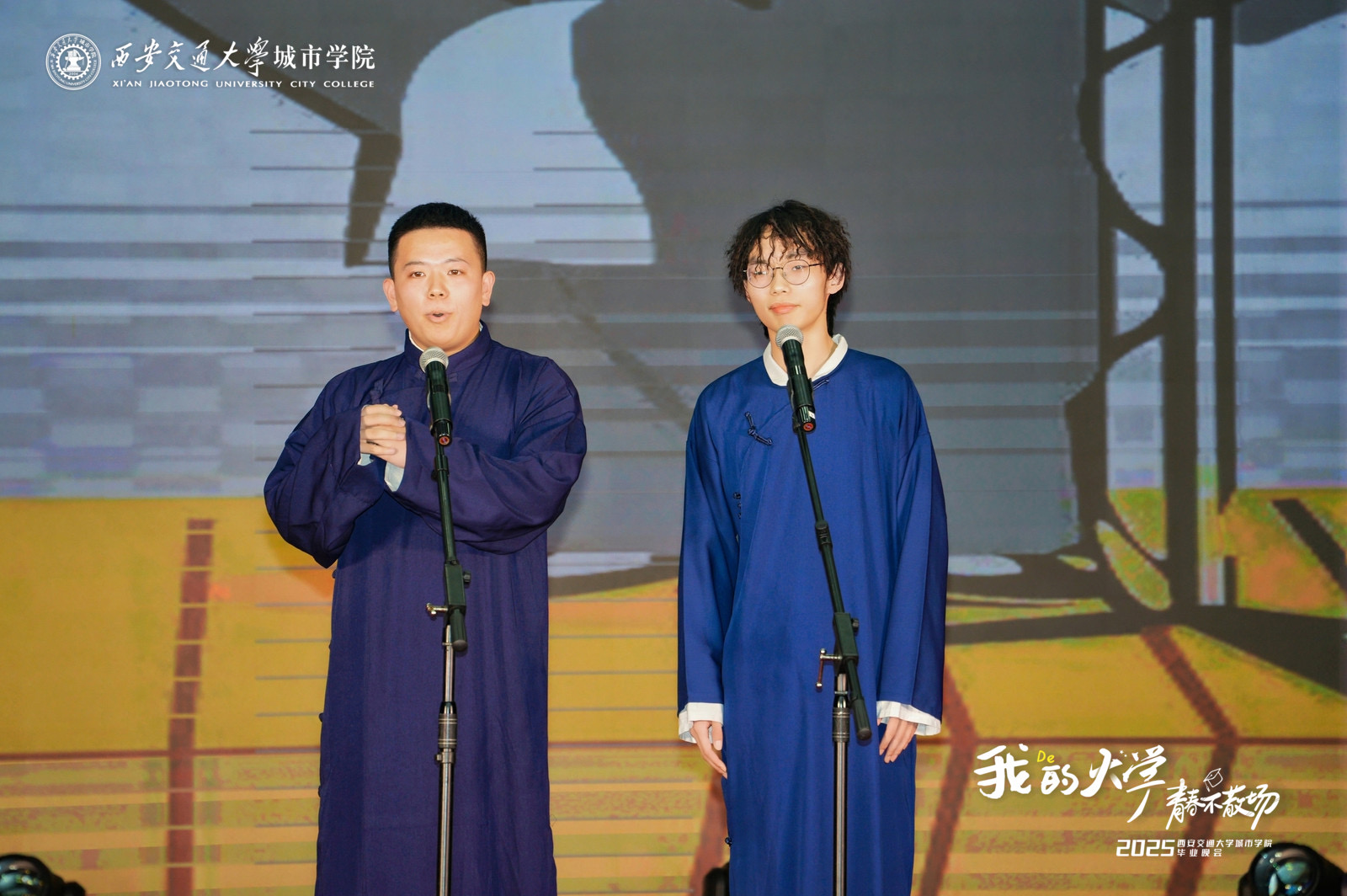 晚会分为三个篇章,分别是“韶光绘梦”“山河同赴”“未来可期”。第一篇章“韶光绘梦”中率先登场的是藏族舞蹈《天浴》,舞者以优美灵动的舞姿、结合音乐时而细腻柔美,时而宏伟壮丽的情感,诠释自然与人文交融之美,展现了藏族舞蹈的独特魅力,将校园岁月的纯真与美好缓缓铺陈。“只是因为在人群中多看了你一眼,再也不能忘掉你容颜”,随着歌曲《传奇》悠扬的旋律,张明明和张宸硕两位毕业生向大家传递青春里那些朦胧又珍贵的情愫,让观众沉浸于音乐编织的美好意境。相声《知书识礼》以幽默对话、趣味演绎,展现校园文化滋养下的青春朝气,笑声中藏着学子对知识与成长的感悟,令人捧腹大笑。随后,街舞社的一支《向上》灯光舞将欢乐的氛围推向高潮,蓝色荧光棒和利落干脆的舞步在动感节奏带动下尽情地舞动,节目中彰显青春的蓬勃力量与向上姿态,是毕业生们逐梦途中拼搏精神的生动注脚。