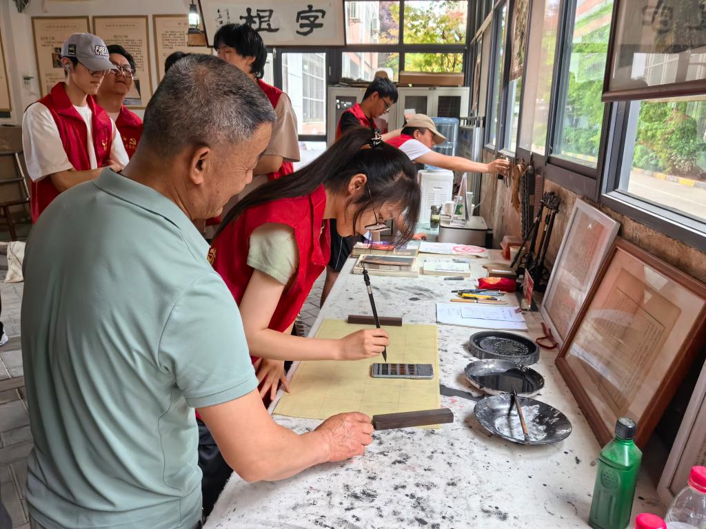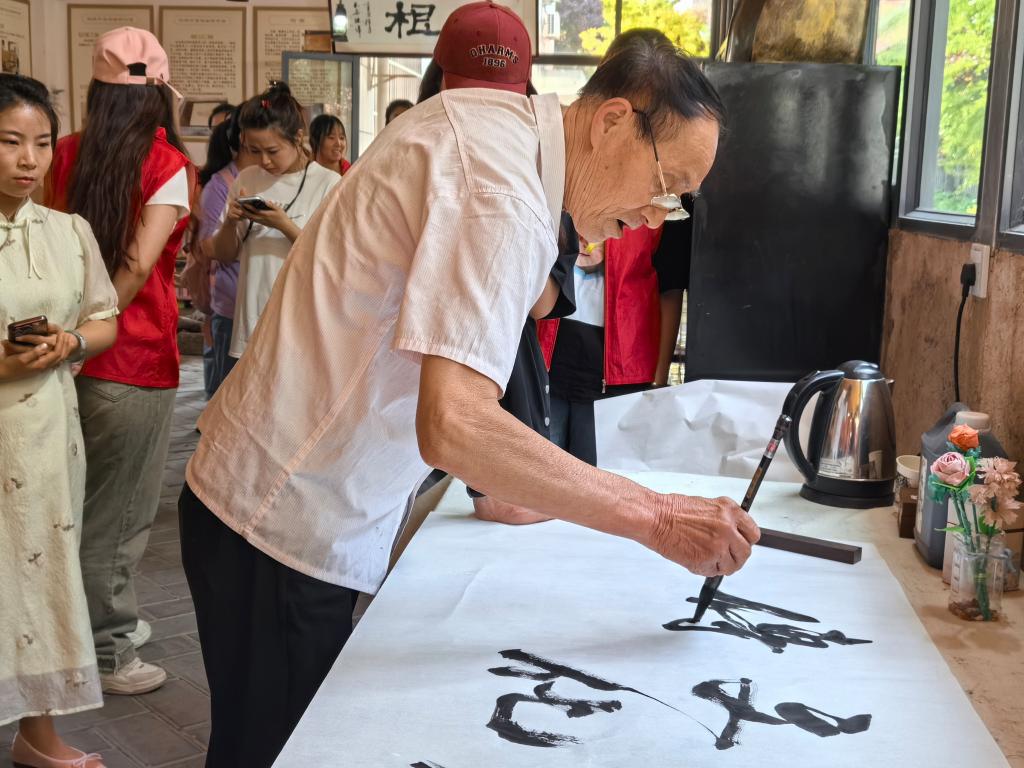 在观看北张村造纸技艺制作过程中,杨亚飞也与同学们进行交流并耐心解答同学们提出的问题。在工作人员的指导与讲解下,同学们也积极参与到古法造纸的体验活动中。因活动当天恰逢高考首日,活动现场特别邀请了童遵尚老先生对高考学生进行题字,预祝各位考生们“金榜题名”。