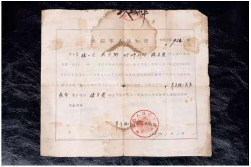 图:1957年 杨宗贵被确认为失踪军人