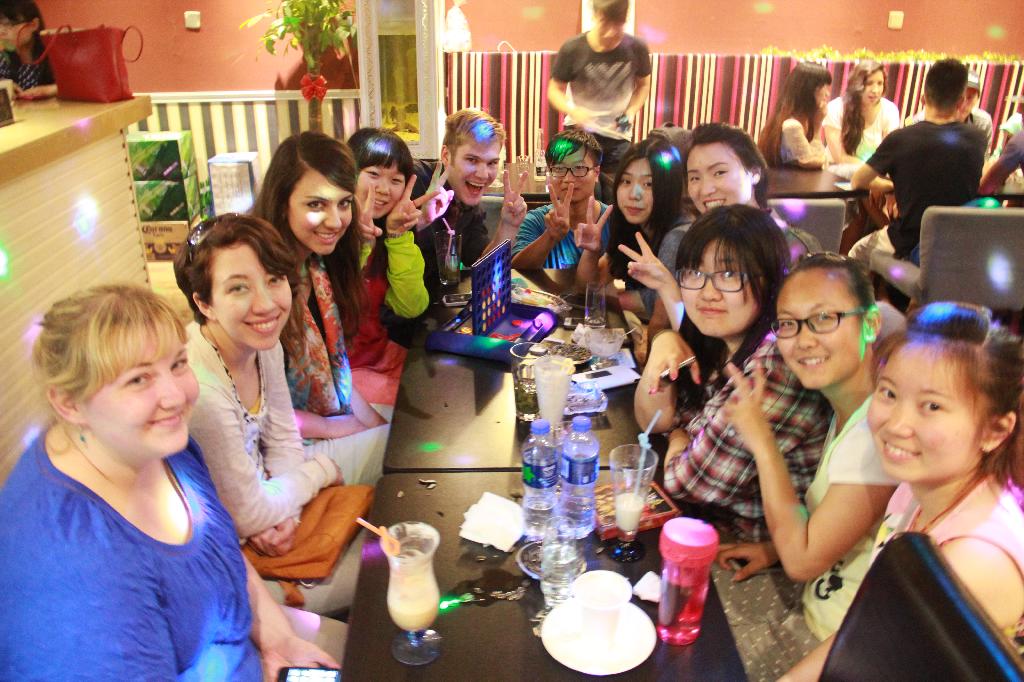 晚上七点,另一批来自美国内布拉斯加林肯大学的十二名交换生以及一名带队老师来到我校与项目办学生及其他来自各系的学生一起进行了友好交流,项目学生带领美方学生游览校园并共进晚餐,饭后大家一起在咖啡店互动,项目办学生演唱了歌曲《喜欢你》并表演了街舞,而美方学生自弹自唱的Jambalaya更是博得了在场同学的阵阵掌声。