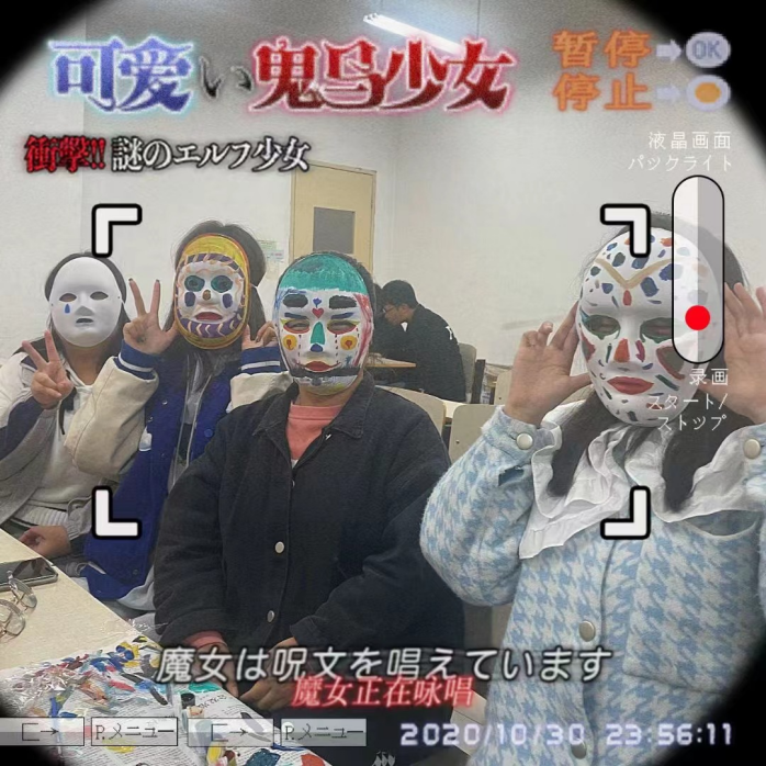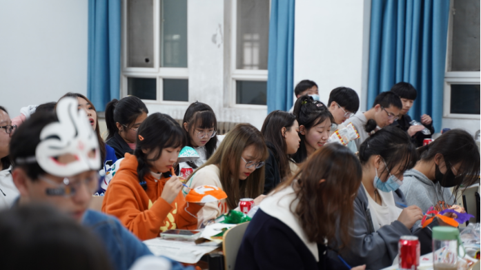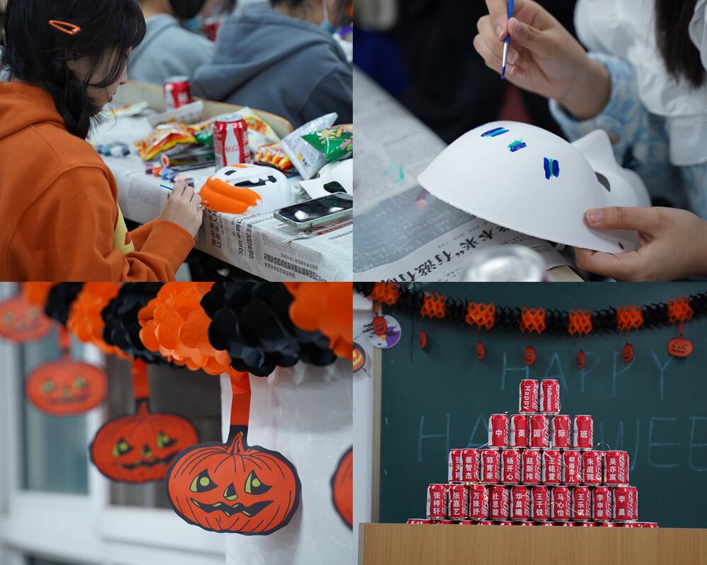 随后,大家一起参与了肢体传声即小组成员通过身体语言传递信息的游戏,考验是小组成员间的默契,增进的是大家之间的友谊;Chocolate Face环节将现场气氛推入高潮,勇敢挑战的学生们将巧克力放在脸部任意区间,然后只靠面部肌肉运动,把饼干运送到嘴里,大家禁不住被各种可爱的表情逗的哈哈大笑,欢乐放松中释放学习的压力;狂甩便利贴游戏中,每队选出裁判员指定人数,站成一排,每人身上提前粘好20个便利贴,裁判员宣布开始后,全队全部将身上便利贴甩掉即为成功。现场同学扭动身体的可爱姿态让大家绽放出灿烂明媚的笑容,增进了彼此的团队凝聚力;在绘制万圣节面具环节,大家在空白面具上绘制自己想要的颜色,你一笔我一画,你来指挥我来涂色,五彩斑斓的面具展示出大家独具创意的想像力。整个活动现场欢声笑语,每一名学生都难以忘怀。最后全体师生共同合影,纪念这个美好的的夜晚。