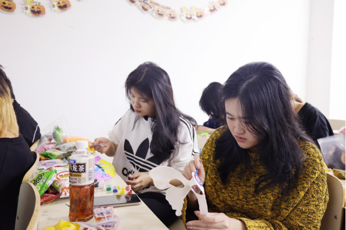 活动开始前,同学们用气球、彩灯和横幅装点教室,共同营造极具派对氛围的活动现场。活动中,大家一起观看了英美节日介绍短视频,并进行了面具绘制、黏土DIY、才艺展示等。