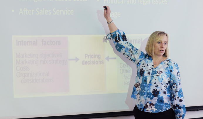 Kay Lousie Smith博士首先从哈德斯菲尔德大学所处地理位置、学校概括、专业设置、住宿条件等为大家分析了在国外学习、生活中安全的重要性,她讲到哈德位于英国中部,是一座平和的小镇,交通便利,隔壁的曼彻斯特城市有机场可以直达国内,去往伦敦的火车也只需要两个小时。接着,为了让即将赴哈德上课的同学对国外授课方式有一个简单的了解,Kay Lousie Smith博士开展了主题为“成本消费者需求、利润地理位置、营销策略等因素对产品定价的影响”的模拟课堂。她先提出定价时需要分析的多种因素,并用两种知名品牌的商业案例来展示两种不同的定价方法,分析出定价时采取先高后低,或者先低后高策略的不同优势。课后就同学们的疑问进行讨论。