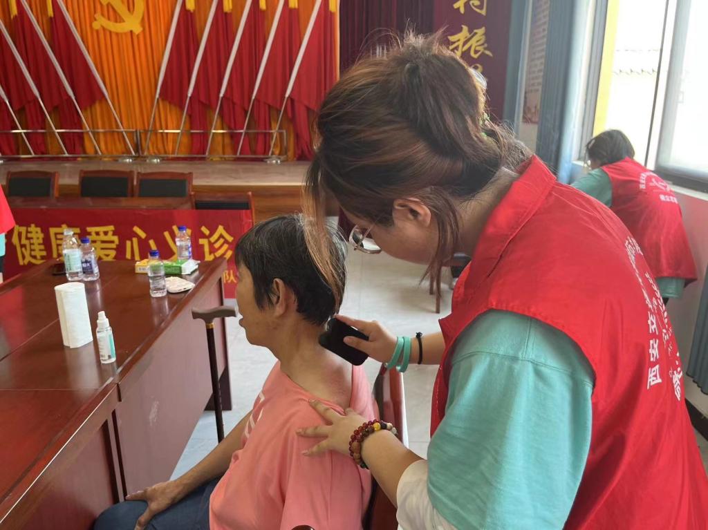 2023年7月9日,史梦鸽带领实践队一行前往合阳县同家庄镇南龙亭村进行艾灸、刮痧、按摩、量血压等爱心义诊活动,并给当地村民进行健康科普,帮助村民们养成科学的生活方式。
